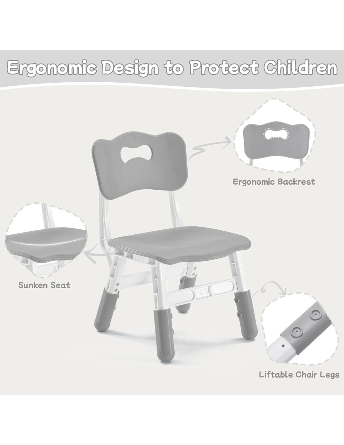 - Diseño Reflexivo: Nuestro conjunto de mesa y sillas para niños GITAWUSA está diseñado ergonómicamente para niños. El respaldo curvado se ajusta perfectamente a la parte baja de la espalda del niño, protegiendo la columna y previniendo la postura encorvada. El asiento hundido asegura comodidad incluso al estar sentado durante largos períodos de tiempo. Los bordes redondeados alrededor de la mesa y sillas para niños lo convierten en una opción confiable para el uso diario.