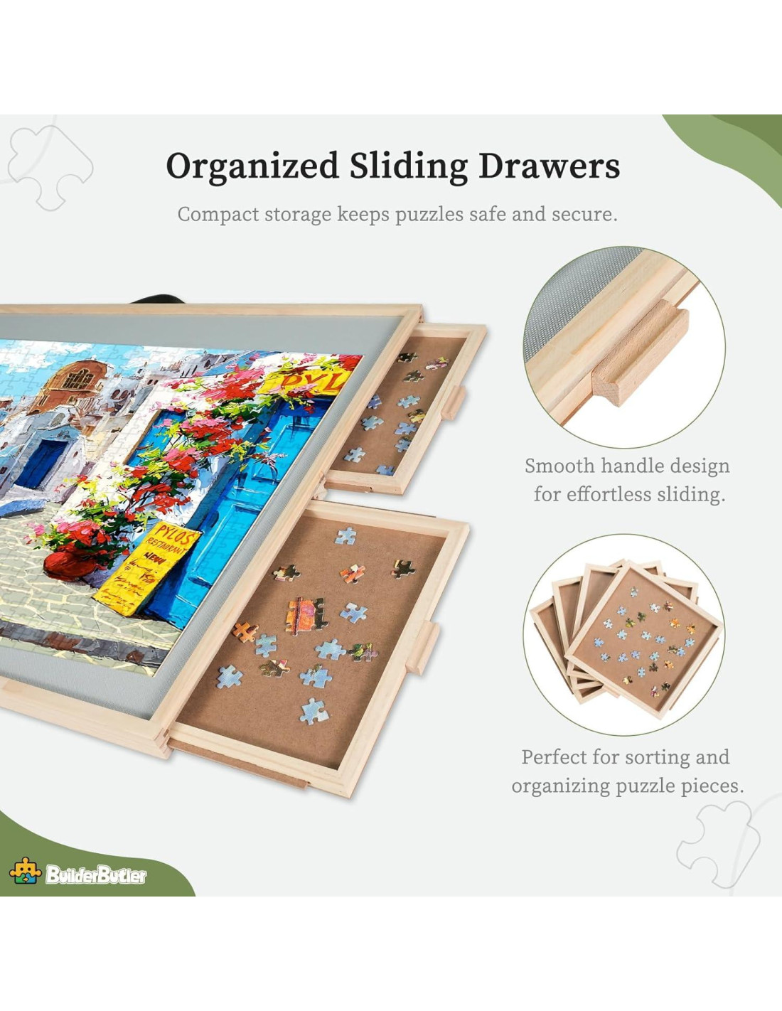 - Protección y Almacenamiento: Mantén tus rompecabezas seguros y organizados con el tablero de rompecabezas BuilderButler. La clara cubierta protectora protege las piezas de derrames, polvo y mascotas, asegurando la integridad a largo plazo del rompecabezas. Cuatro amplios cajones de clasificación permiten una fácil organización y almacenamiento seguro de las piezas. Cuando no se utiliza para rompecabezas, este versátil tablero funciona como un escritorio, mesa de juegos o mesa de café, convirtiéndose en una adición esencial multiusos a tu hogar.
