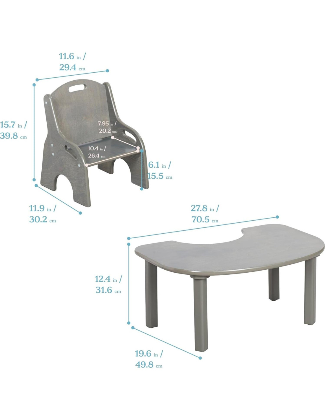 - Dimensiones del Producto: La mesa para niños mide 70.6 cm W x 49.8 cm D x 31.5 cm H; la silla para niños mide 29.5 cm W x 30.2 cm D x 39.9 cm H, altura del asiento 15.5 cm; Se requiere supervisión activa y directa de un adulto