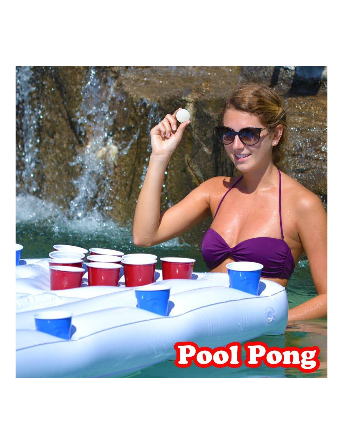 - BEER PONG FLOTANTE: Configuración completa de beer pong de 10 copas en cada lado, portavasos y enfriador incorporado (capacidad para 18 bebidas)