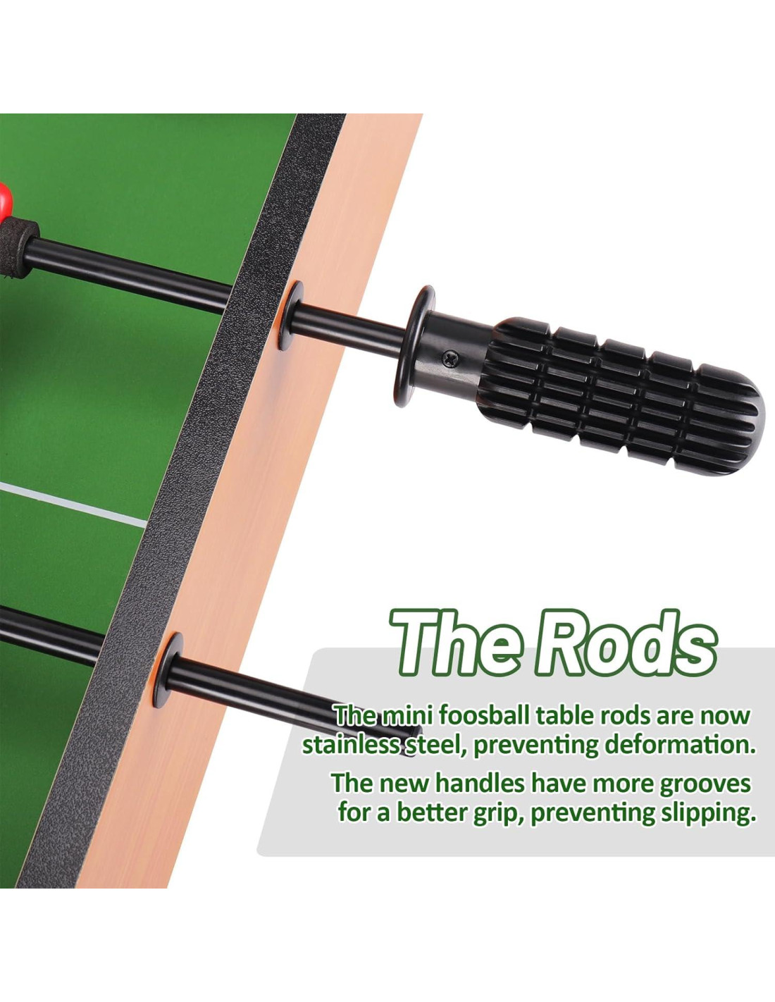 - Mejora de Varillas: Hemos mejorado las varillas de la mesa de futbolín al reemplazar el material de hierro anterior por acero inoxidable. El acero inoxidable ofrece una dureza superior en comparación con el hierro, previniendo efectivamente la deformación de las varillas. Además, las manijas mejoradas ahora cuentan con un mayor número de ranuras, asegurando un agarre más firme y eliminando preocupaciones sobre que se deslicen de tus manos