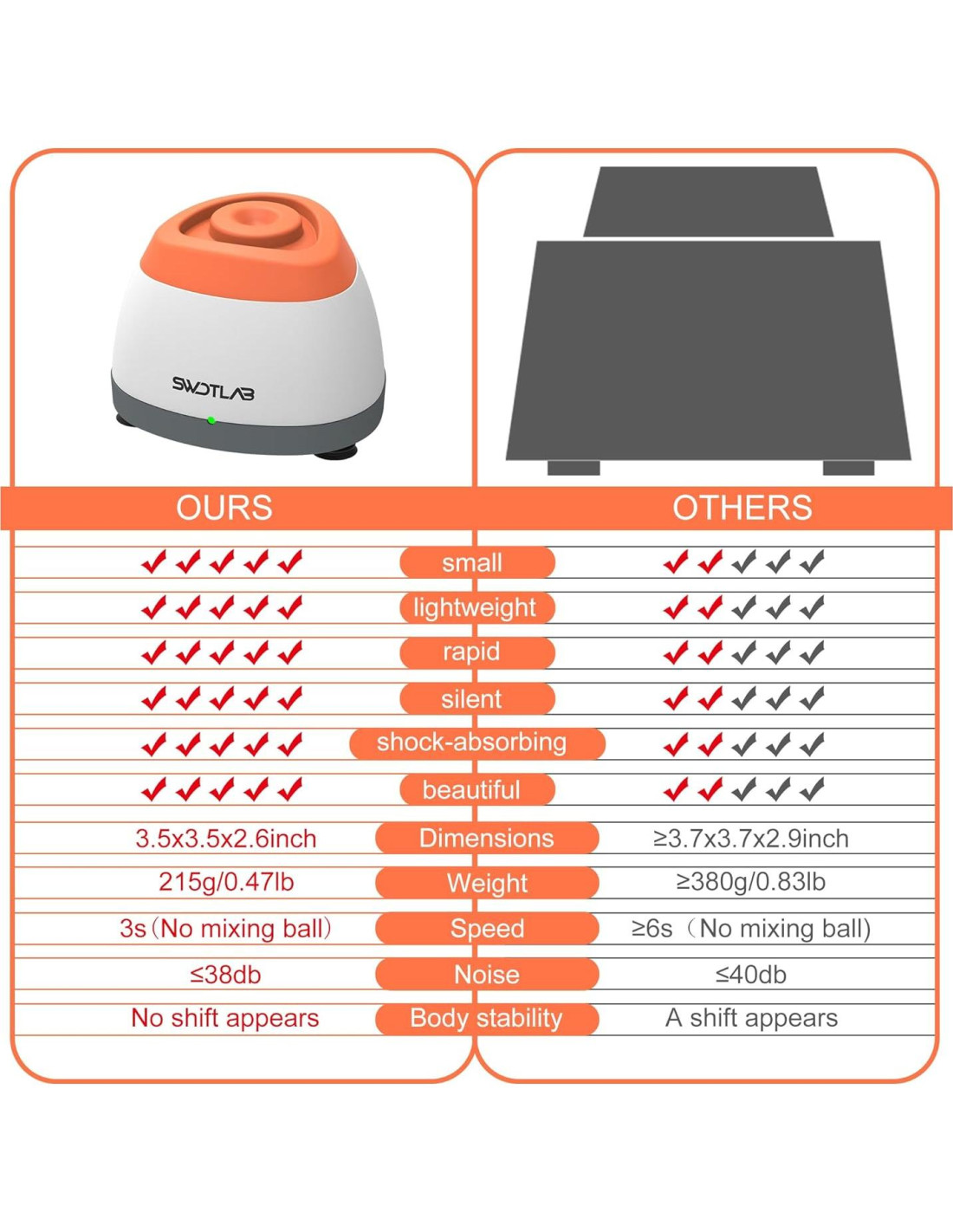 La Máquina Mezcladora de Líquidos SWDTLAB mezcla eficientemente pinturas, esmalte de uñas, tinta de tatuaje, pegamento para pestañas, pinturas de hobby acrílicas y otros líquidos difíciles. Ideal para salones de uñas, estudios de artistas, tiendas de tatuajes y laboratorios. Fácil de usar: Solo toca la tapa de silicona superior con tu recipiente de líquido, no se necesitan botones. La agitación Vortex mezcla líquidos más rápido y de manera más uniforme que agitar, ofreciendo resultados suaves y consistentes cada vez. Este potente mezclador mantiene la boquilla de tu esmalte en gel súper limpia, previene burbujas y funciona en silencio. Construcción duradera para un uso a largo plazo.
