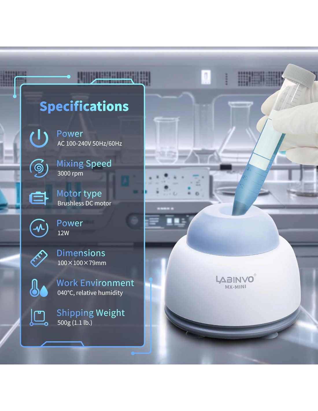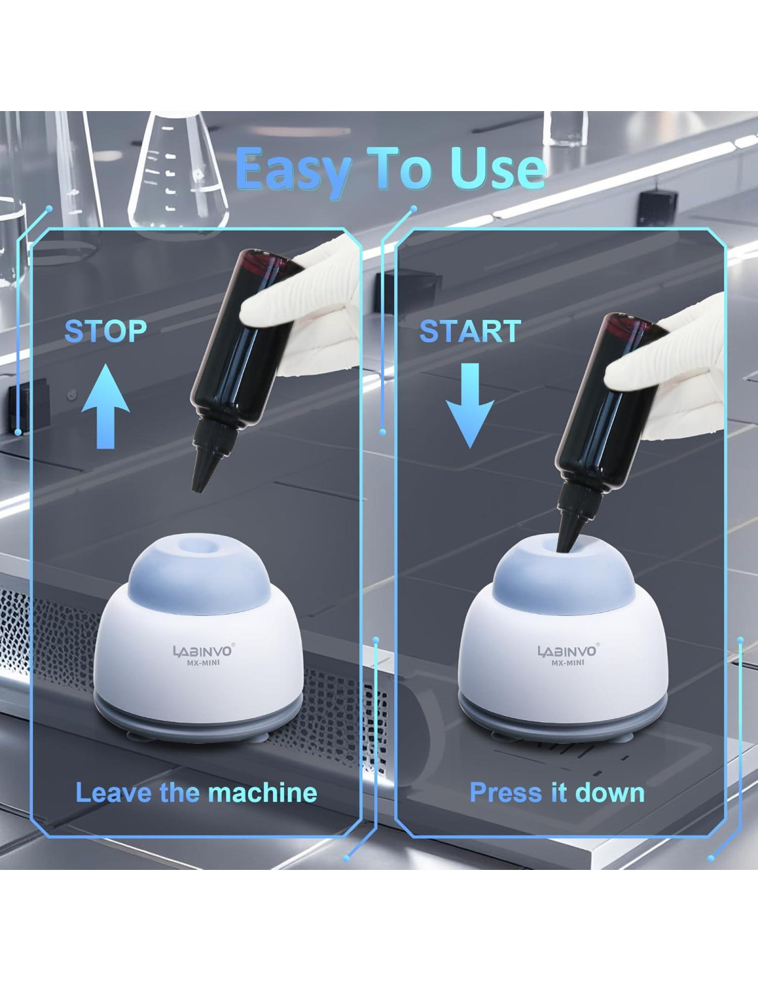 - Capacidad de mezcla: Motor de CC sin escobillas libre de mantenimiento proporciona una gran potencia y asegura una larga vida útil. El motor puede activar y mezclar rápidamente muestras en un recipiente de 50ml (1.69 onzas) en 3 segundos, y el líquido puede ser completamente agitado.