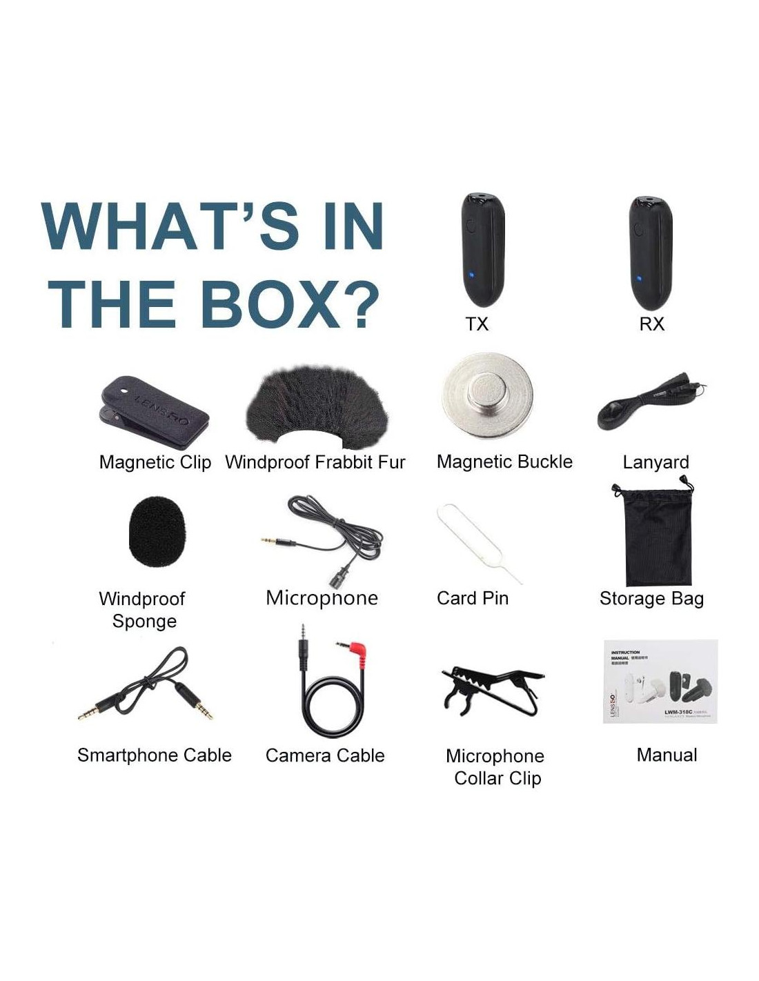 - Horas de Trabajo y Alcance: El sistema de micrófono lavalier inalámbrico, cada unidad tiene una batería recargable de 500 mAh incorporada, que puede seguir funcionando durante 4 horas después de estar completamente cargada. El rango más lejano es de 98.4 pies (30 m) en áreas abiertas, el mejor rango de recepción es dentro de 65.6 pies (20 m).