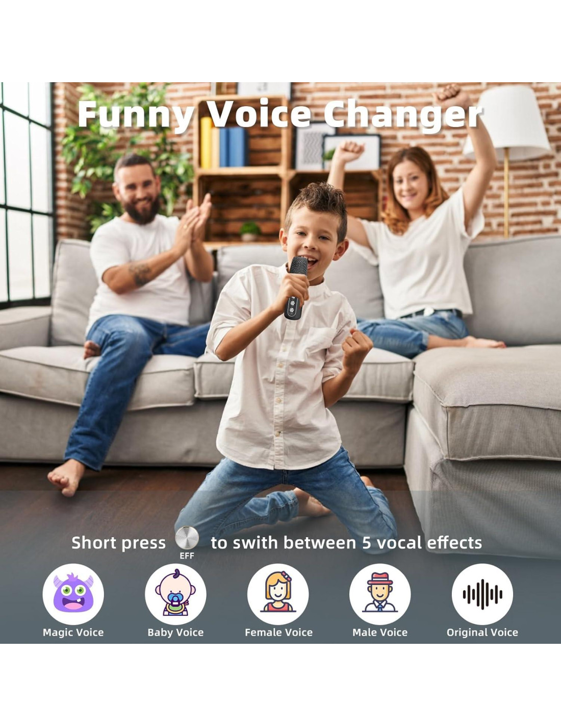 - [7 Efectos de Sonido Interesantes] Nuestra mini máquina de karaoke tiene siete tipos de efectos de voz mágicos: original, monstruo, bebé, femenino, masculino y 2 mezclas, que pueden satisfacer más necesidades y brindar más diversión. El micrófono con cambiador de voz es perfecto para karaoke en el coche, fiestas en casa, aulas, discursos y muchas otras ocasiones.