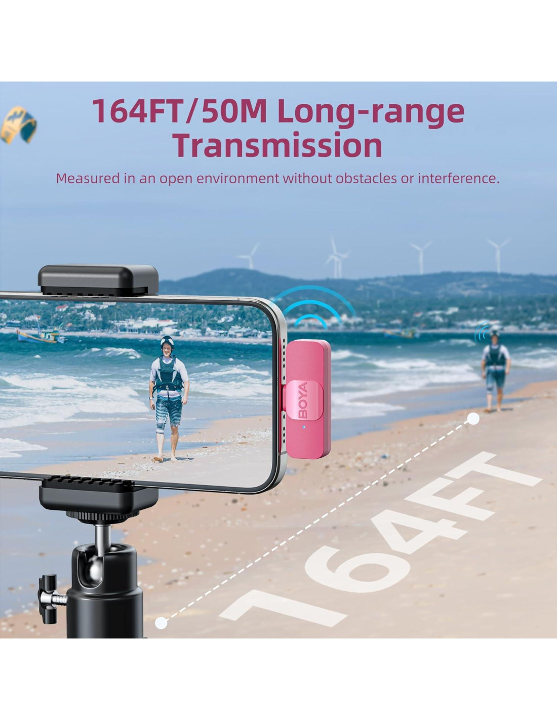 - Sistema Inalámbrico Universal: El pequeño micrófono de solapa funciona sin cables con transmisión de señal de 2.4G, asegurando una latencia super baja para una grabación de audio fluida. Puede ser sostenido en la mano o clipado a tu camisa, con un diseño de clip trasero rotatable para una fácil colocación. Cubriendo un rango de hasta 164 pies (50 metros), te ayuda a eliminar cables desordenados mientras grabas o filmas claramente desde una distancia, ya sea en interiores o exteriores.