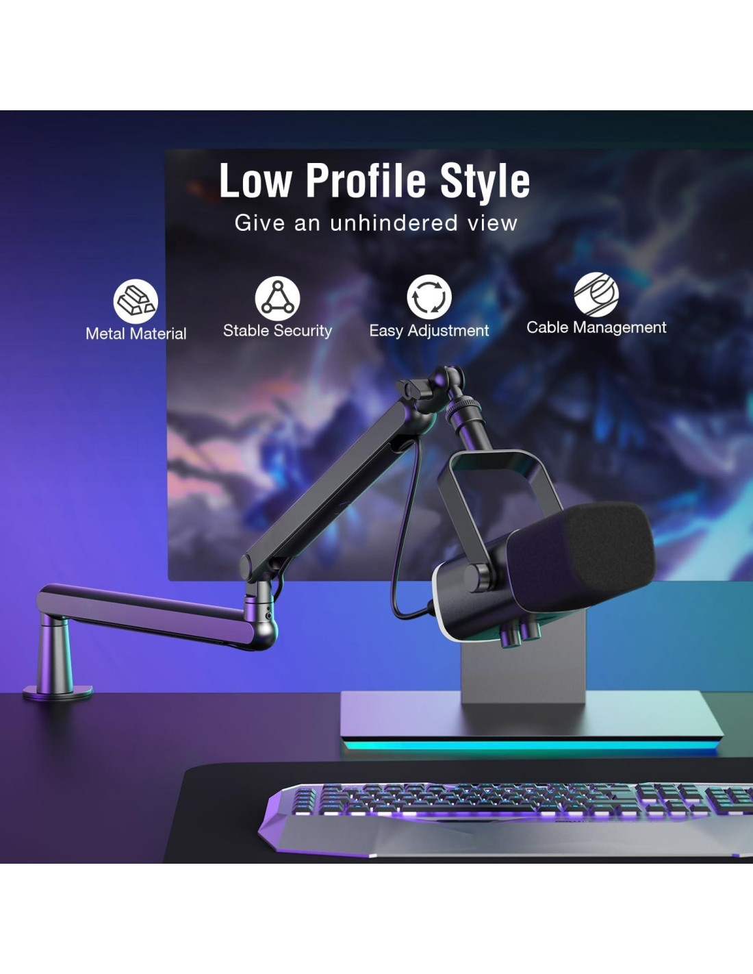 - [Ajuste de Perfil Bajo] El kit de soporte de brazo puede extenderse desde la parte inferior de la pantalla de tu computadora. El soporte de micrófono ahorra más espacio en una vista sin obstrucciones. El conjunto de soporte de brazo de suspensión puede extenderse hasta 73.66 centímetros (29 pulgadas), adecuado para tu escritorio de oficina grande. El paquete de brazo de boom se puede ajustar hacia arriba y hacia abajo en 220 grados, y horizontalmente en 360 grados. Más ajustes de ángulo proporcionan más opciones de uso.