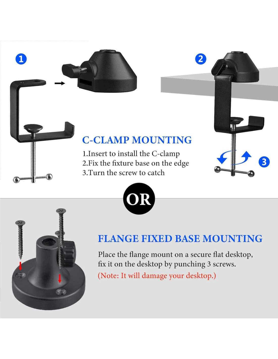 - El brazo de extensión de micrófono de escritorio se puede adjuntar a una mesa o escritorio de hasta 2.4 pulgadas (6 cm) de grosor con el soporte de abrazadera en C incluido, que puede girar 360 grados.
