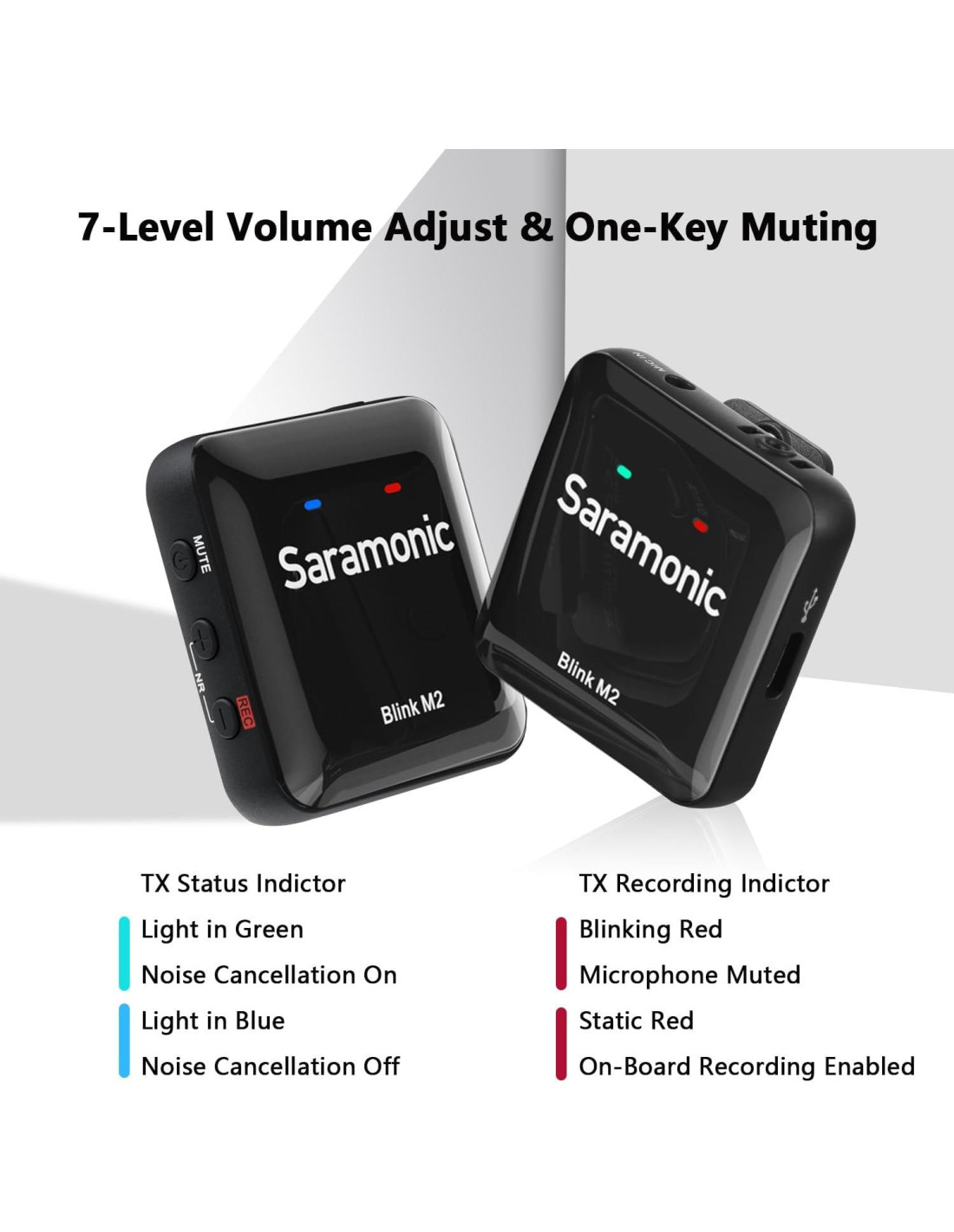 - Cancelación de Ruido y Silencio con un Clic: El micrófono lavalier inalámbrico Saramonic Blink M2 cuenta con un chip DSP de cancelación de ruido de última generación, que proporciona una efectiva cancelación de ruido ambiental, y hace que tu voz en video sea clara y limpia. Un clic para activar el silencio, la luz indicadora parpadea en rojo. 6 niveles de ganancia se pueden ajustar libremente según sea necesario.