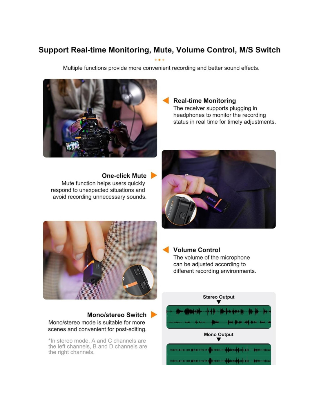 - Reducción de Ruido con un Solo Botón: Después de años de investigación por parte del departamento de I+D de Comica, el algoritmo de procesamiento de audio CalMix identifica con precisión las voces humanas y filtra el ruido en entornos complejos como calles o centros comerciales