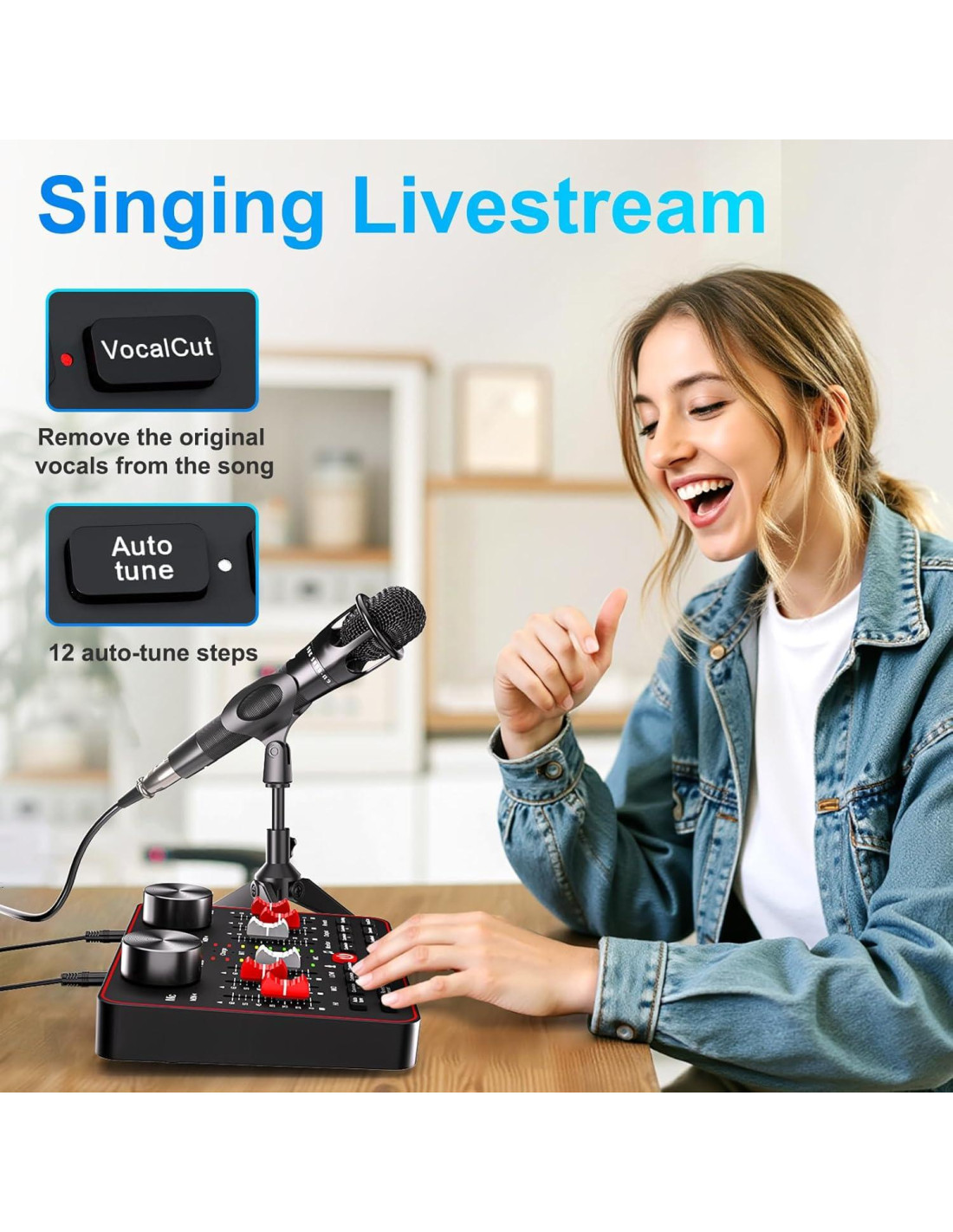 - [Efectos de Sonido Personalizables y Control de Voz] Toma el control total de tu sonido con configuraciones personalizables para graves, agudos, reverberación, tono y más. Además, la mesa de sonido puede personalizar 6 efectos de sonido, como aplausos y risas, para hacer que tus transmisiones sean más atractivas y entretenidas.
