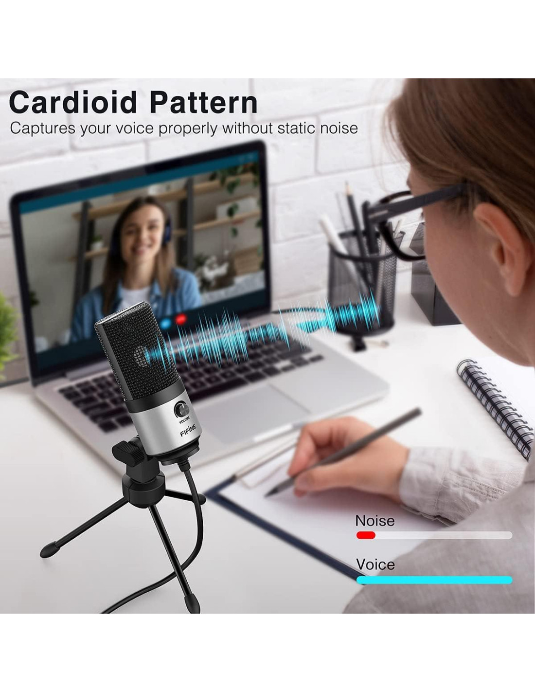 - La perilla en la parte frontal del micrófono de escritorio es útil para aumentar/reducir el sonido. También puedes bajarlo completamente para silenciar el micrófono. Con la ayuda del soporte pivotante incluido, puedes ajustar rápidamente el ángulo y la posición del micrófono para reuniones de Zoom o charlas.