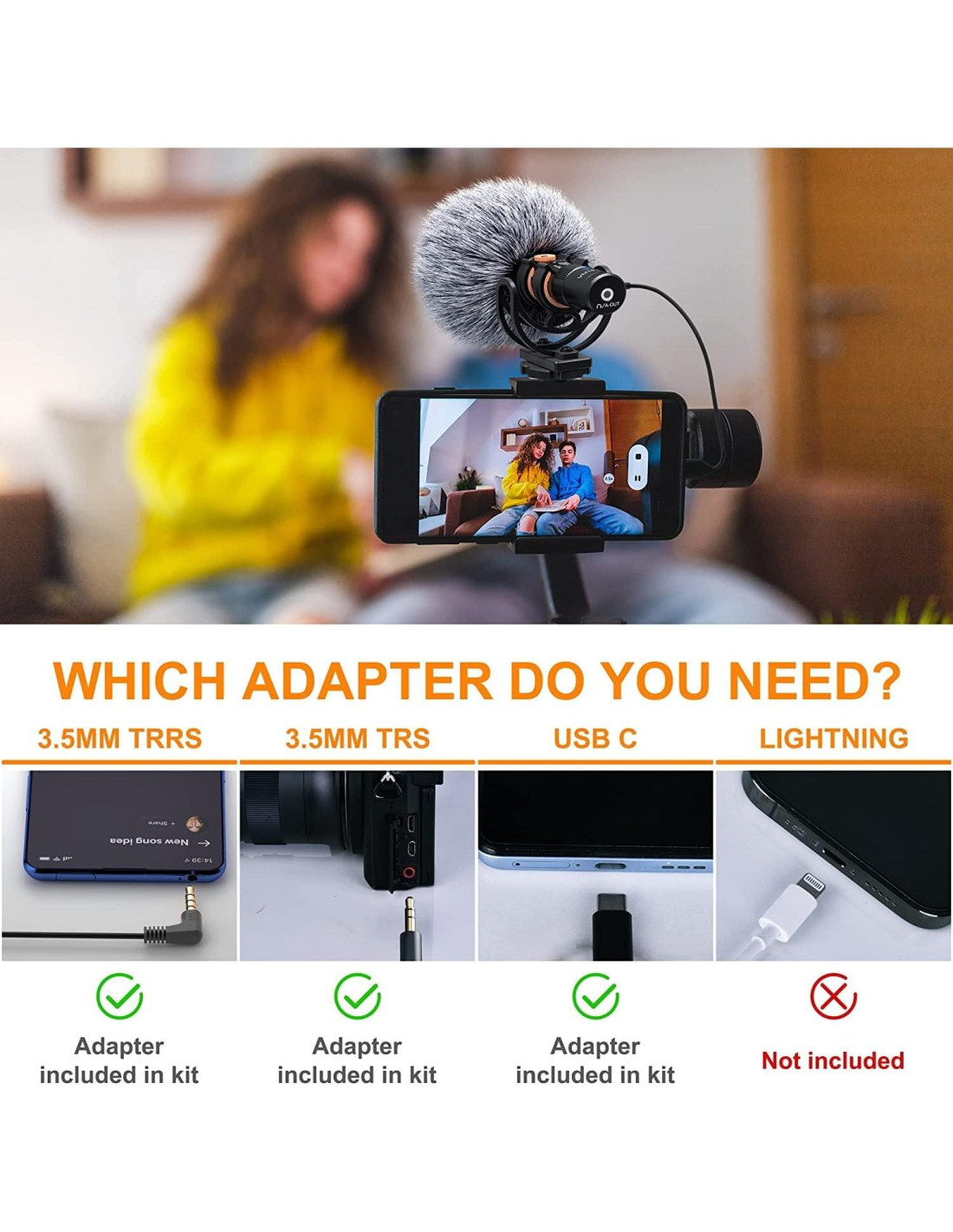 - Modo de Salida Digital / Analógica Cambiable El micrófono de cámara VM10 PRO puede cambiarse entre dos modos diferentes y tiene un amplio rango de aplicaciones. Ampliamente compatible con dispositivos con interfaz de 3.5mm y USB. Incluye cables de micrófono USBC y 3.5mm, ampliamente utilizado para iPhone, smartphones Android, laptops, computadoras y cámaras. Nota: cable adaptador para iphone NO incluido.