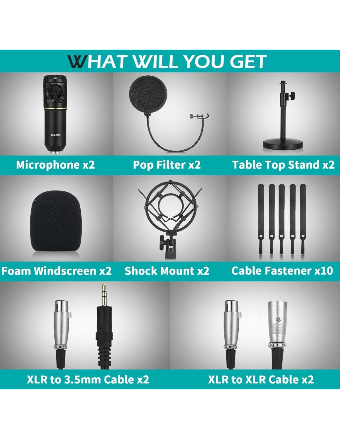 - El Paquete de Accesorios Incluye: el paquete incluye 4 paquetes de equipos de grabación de condensador, 4 piezas de montajes antichoque de grado de estudio, 4 piezas de soportes antichoque, 4 piezas de algodones a prueba de viento, 4 piezas de redes antidesbordamiento, 4 piezas de cables de micrófono de 3.5 mm, 4 piezas de varillas metálicas, 4 piezas de bases de disco, 4 piezas de cables masculinos y femeninos, 20 piezas de tiras de velcro, un manual de usuario, que es un conjunto completo de partes, un paquete práctico para satisfacer tus necesidades diarias y también para compartir con tu equipo.