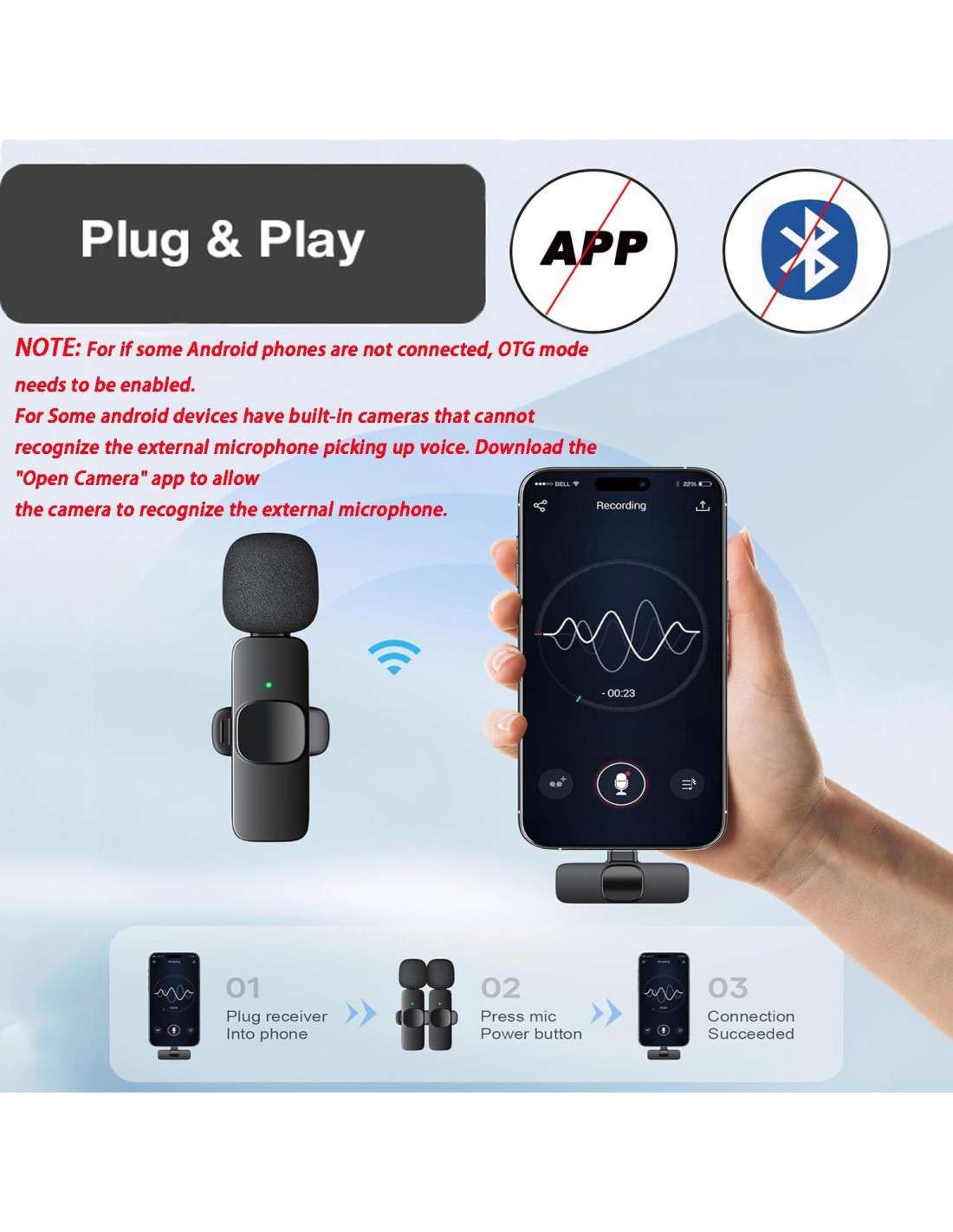 - [Transmisión Estable de 19.81 m] Este micrófono lavalier inalámbrico para iPhone con tecnología de transmisión inalámbrica de 2.4GHz que permite una distancia ultra larga de 19.81 m, tecnología inalámbrica de alto rendimiento que garantiza estabilidad de señal, sincronización de sonido e imagen y fuerte penetración, grabación libre sin restricciones.