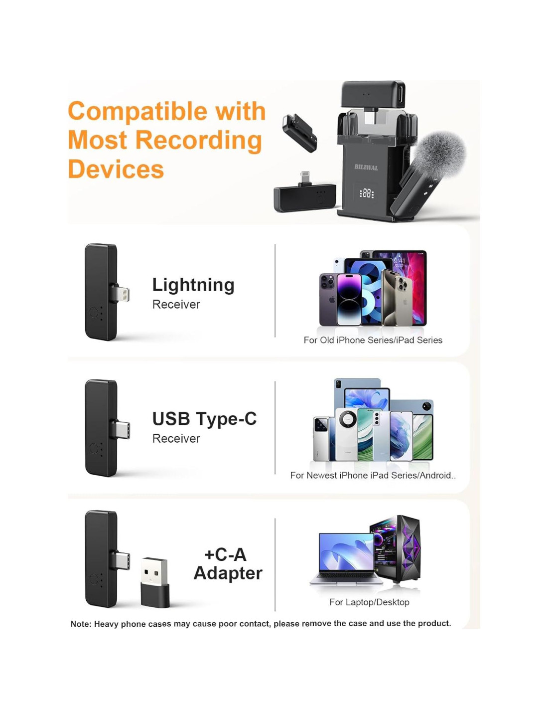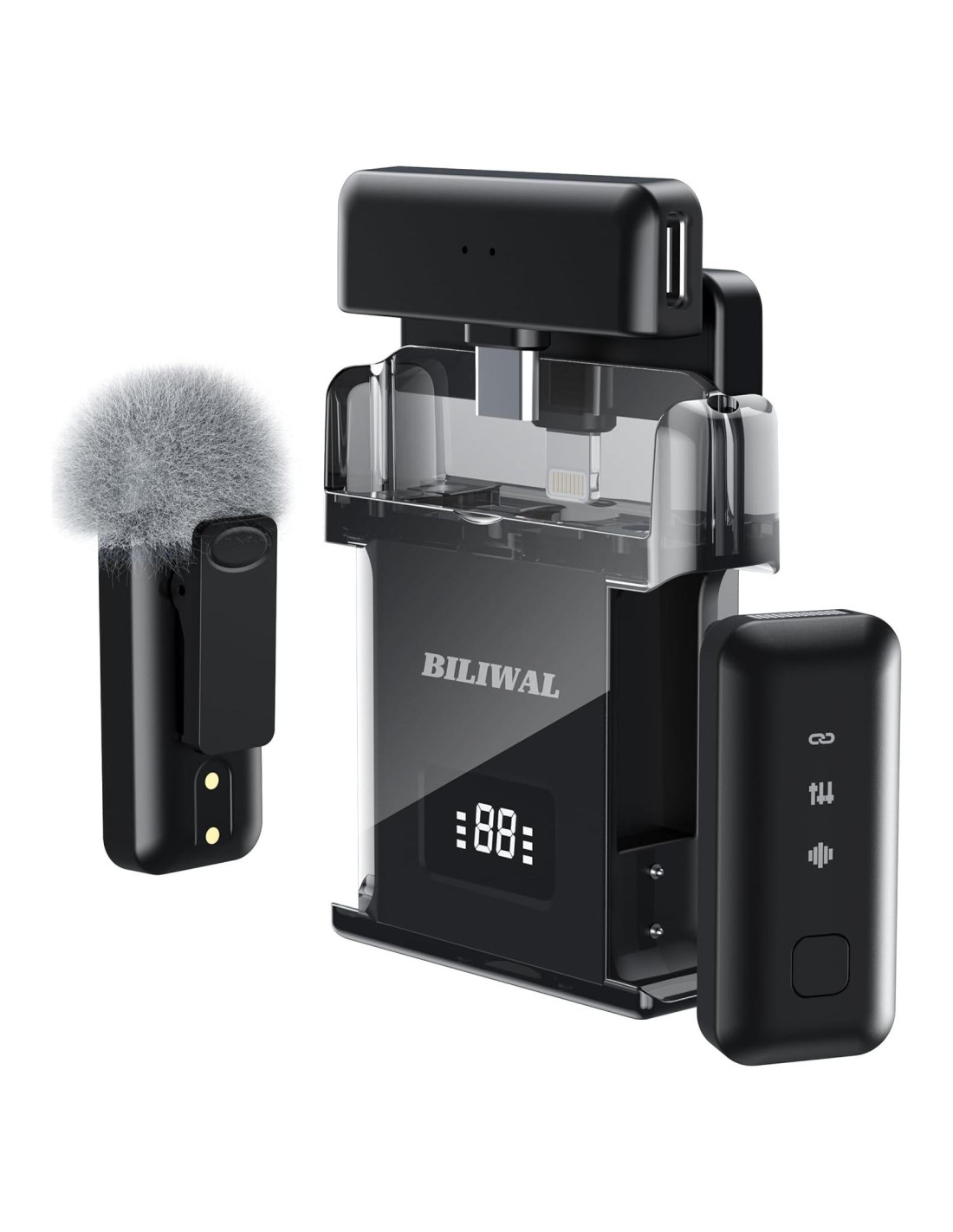- [COMPACTO Y MAGNÉTICO] El sistema de micrófono inalámbrico BILIWAL es todo en uno, con receptor de puerto USBC/lightning, compatible con la mayoría de los dispositivos a través del adaptador USB A incluido. El clip magnético y el micrófono magnético se pueden usar de forma segura en toda la ropa. Micrófono 8 g (0.28 oz) / 1.6 cm x 1.8 cm x 4.1 cm, estuche de carga con micrófono 60 g (2.12 oz) / 1.8 cm x 5.5 cm x 6.2 cm