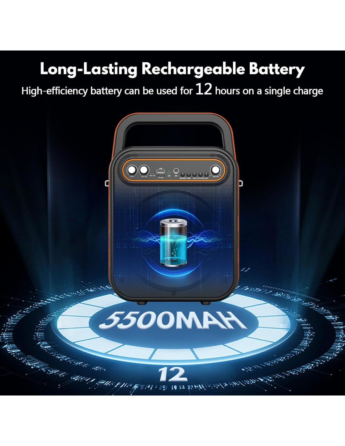 - Tiempo de reproducción extendido: Con su potente batería de 5500mAh, el altavoz de karaoke ofrece hasta 12 horas de entretenimiento ininterrumpido con una sola carga. Además, se recarga completamente en solo 6 horas, manteniendo la música en marcha por más tiempo sin interrupciones, podrás tener el control total de tu fiesta.