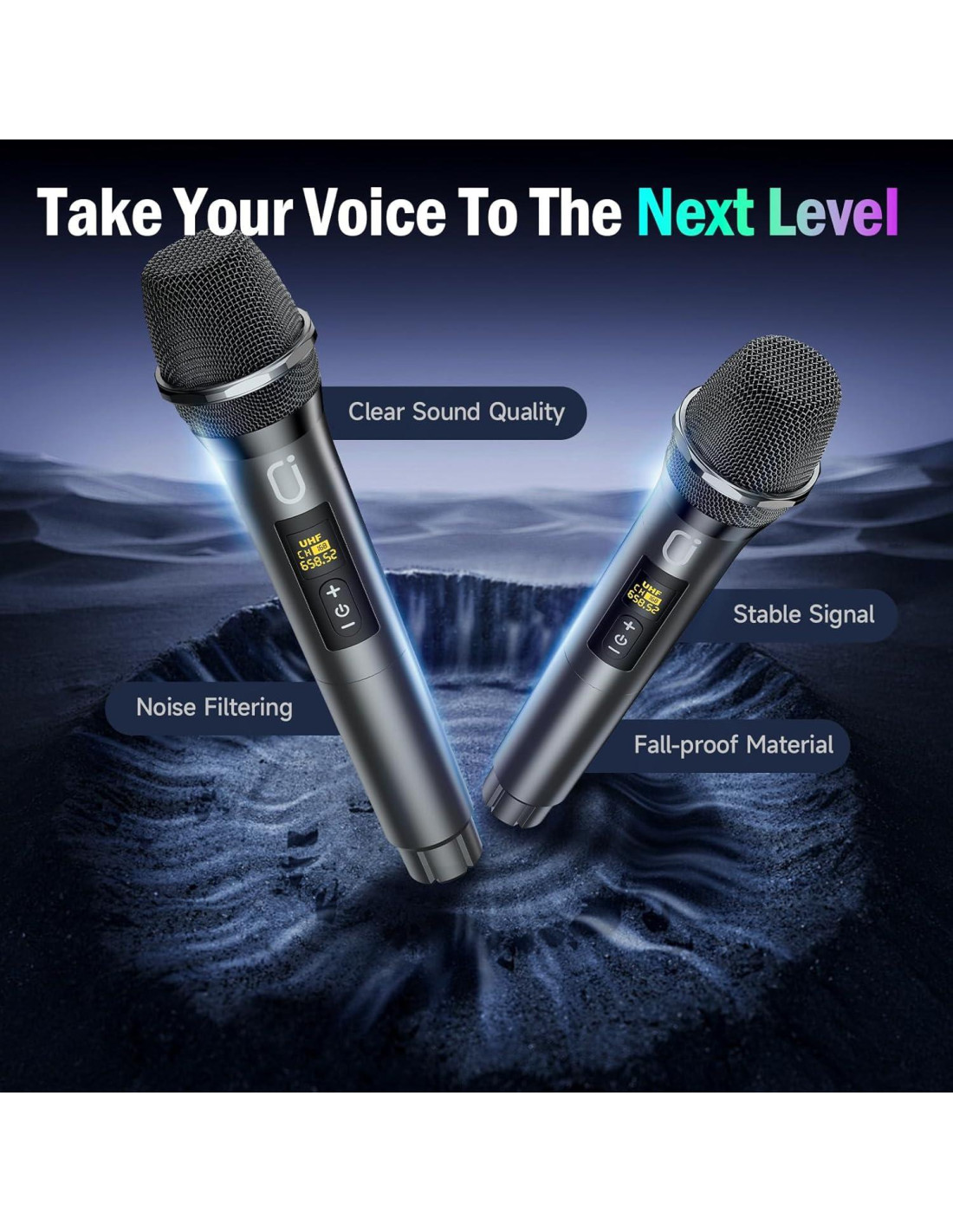 - [Micrófonos UHF Profesionales y Control Remoto] Captura tu voz con precisión mientras filtra inteligentemente el ruido. El control remoto te permite cambiar fácilmente entre canciones y modos de reproducción