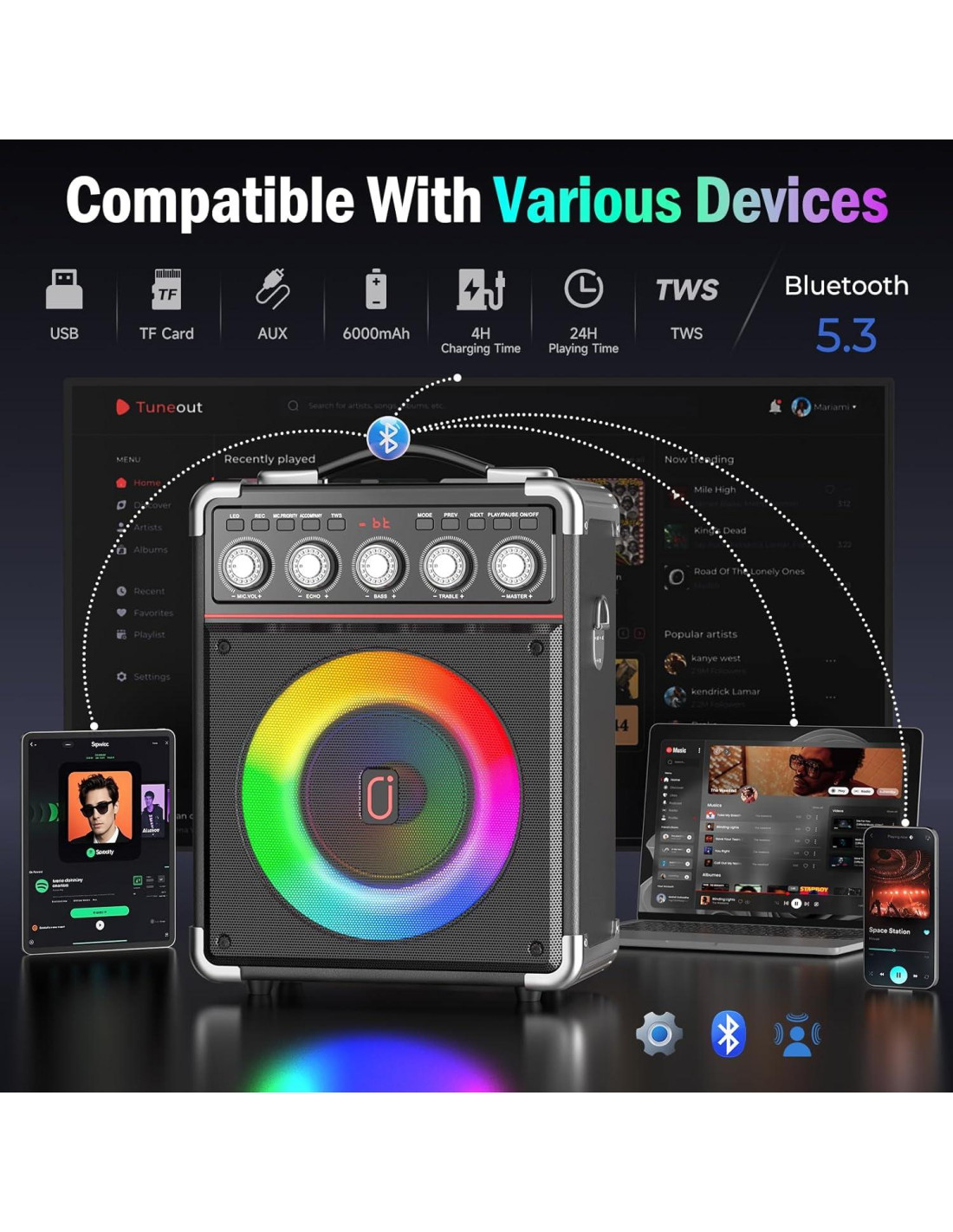 - [Sistema de Sonido Surround HD] Con tecnología avanzada de separación de subwoofer y tweeter que asegura que cada nota y ritmo se reproduzca con precisión, entregando audio cristalino. Conecta 2 cajas de fiesta idénticas para activar el modo TWS. Prepárate para una verdadera aventura auditiva que llevará tu fiesta al siguiente nivel