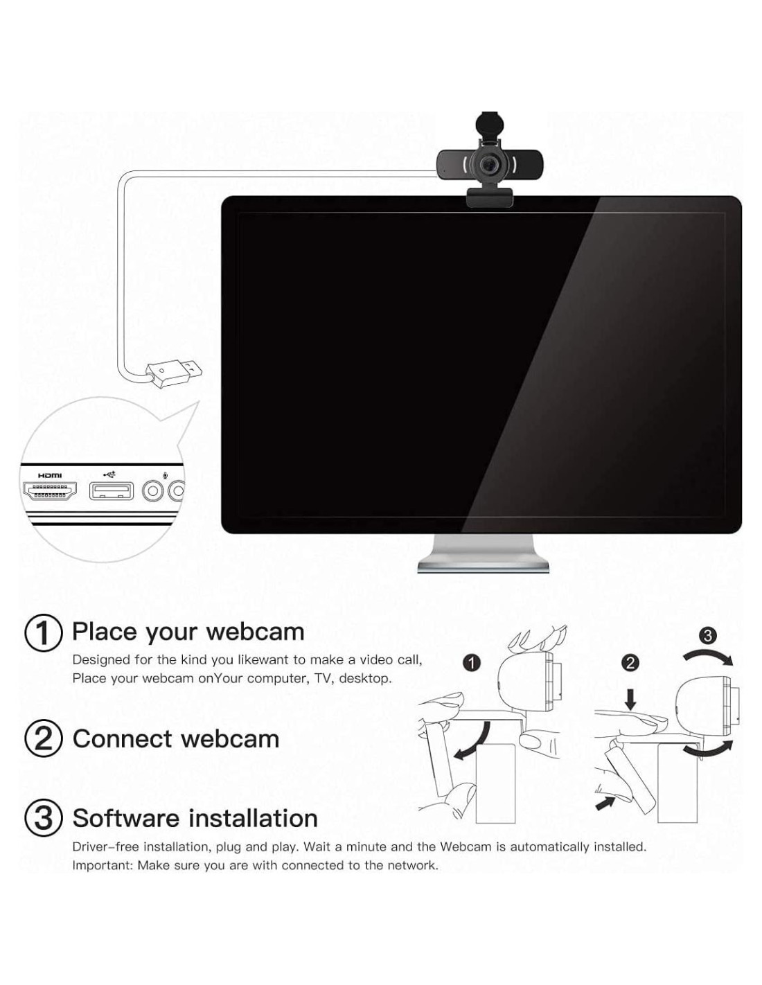 - Cámara USB Plug and Play La cámara web HD es muy fácil de usar. El conector USB permite una configuración sencilla. No se requiere controlador adicional. Más importante aún, nuestras cámaras de PC de escritorio cuentan con un clip rotatable listo para trípode (trípode no incluido), clip universal ajustable que se adapta a tus necesidades de múltiples ángulos en computadoras, laptops, escritorios, Mac, PC, televisores inteligentes, monitores LCD y otras superficies planas.