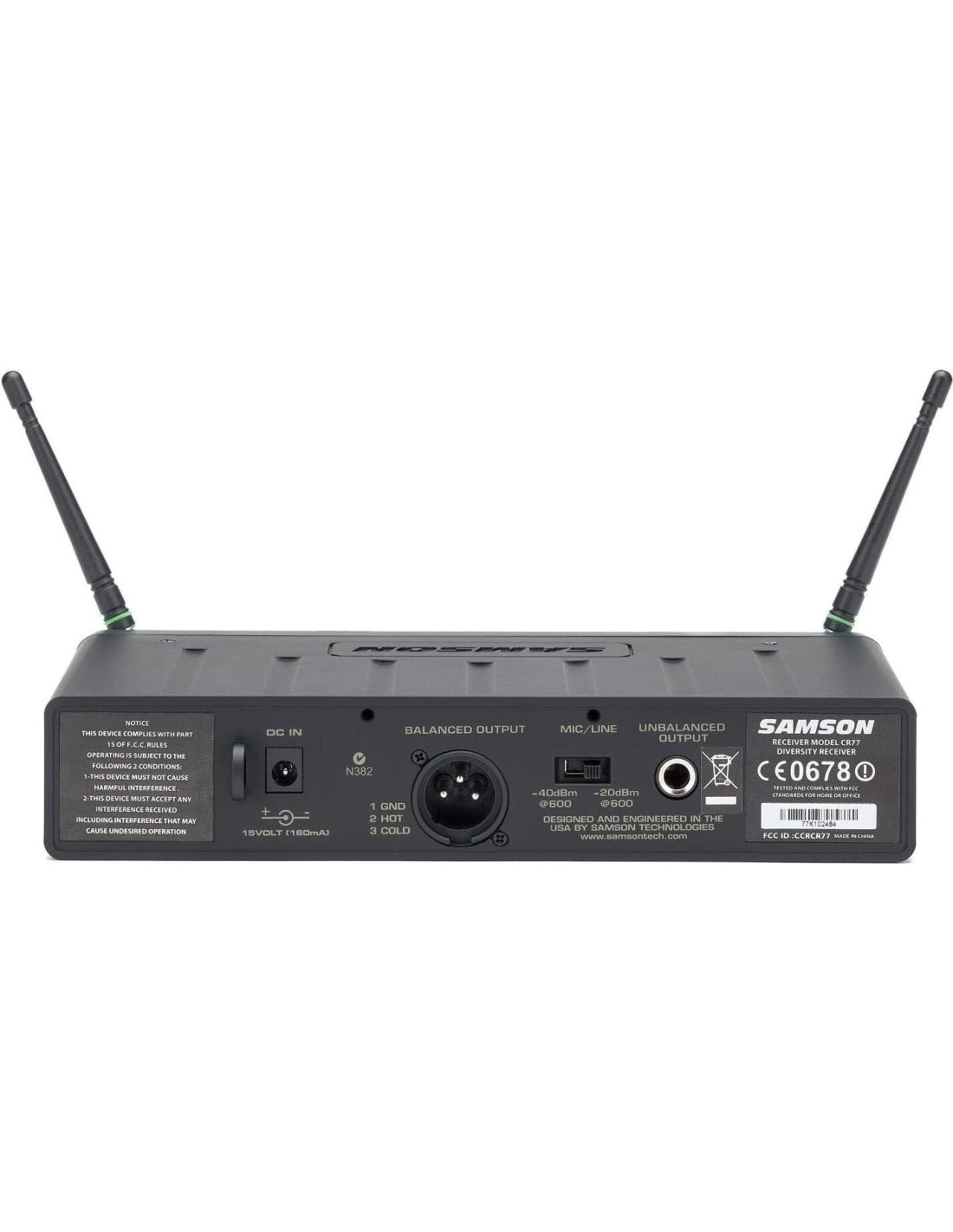 El sistema de auriculares de fitness Samson AirLine 77 AH7 es una solución de micrófono inalámbrico diseñada para satisfacer las demandas específicas de los instructores de fitness y los intérpretes activos. Con el exclusivo microtransmisor AH7 montado en un micrófono de auriculares Qe resistente al sudor, puedes liberarte completamente de cables y mochilas para una experiencia verdaderamente emocionante y motivadora. Esto te permite concentrarte en tu clase o actuación, sin preocuparte por tu audio. Move Free Samson revolucionó lo inalámbrico con el transmisor AirLine original. Basándose en esta tecnología innovadora, el microtransmisor AH7 está montado directamente en los auriculares. Esto es único en comparación con los sistemas inalámbricos tradicionales que normalmente utilizan una mochila con un cable que va del micrófono al transmisor. El AH7 elimina estos componentes adicionales que serían especialmente engorrosos para un instructor de fitness y coloca todo lo que necesitas de manera ordenada y cómoda alrededor de tu cabeza. Y el transmisor funciona hasta ocho horas seguidas con una sola batería AAA. El Micrófono Adecuado para Fitness El Transmisor de Auriculares AH7 está montado en un auricular ligero y ajustable que se adapta cómodamente alrededor de tus oídos y la parte posterior de tu cabeza, incluso en esos días en que enseñas clases consecutivas durante horas. El auricular también cuenta con el micrófono de condensador Samson Qe, cuyo cápsula resistente al sudor previene la corrosión por exposición prolongada a la humedad. Además, el patrón de captación bidireccional del micrófono reduce el ruido de fondo, minimiza problemas de retroalimentación y rechaza efectivamente señales que no provienen directamente frente a la cápsula del micrófono. Sonido Recibido El receptor CR77 True Diversity proporciona un rendimiento confiable con hasta 300' (90m) de operación inalámbrica. Su carcasa de media unidad es lo suficientemente ligera como para llevarla en tu bolsa, o puede ser instalada permanentemente con un kit de montaje en rack (se vende por separado). El panel trasero cuenta con salidas XLR balanceadas y 1/4 no balanceadas que permiten fl
