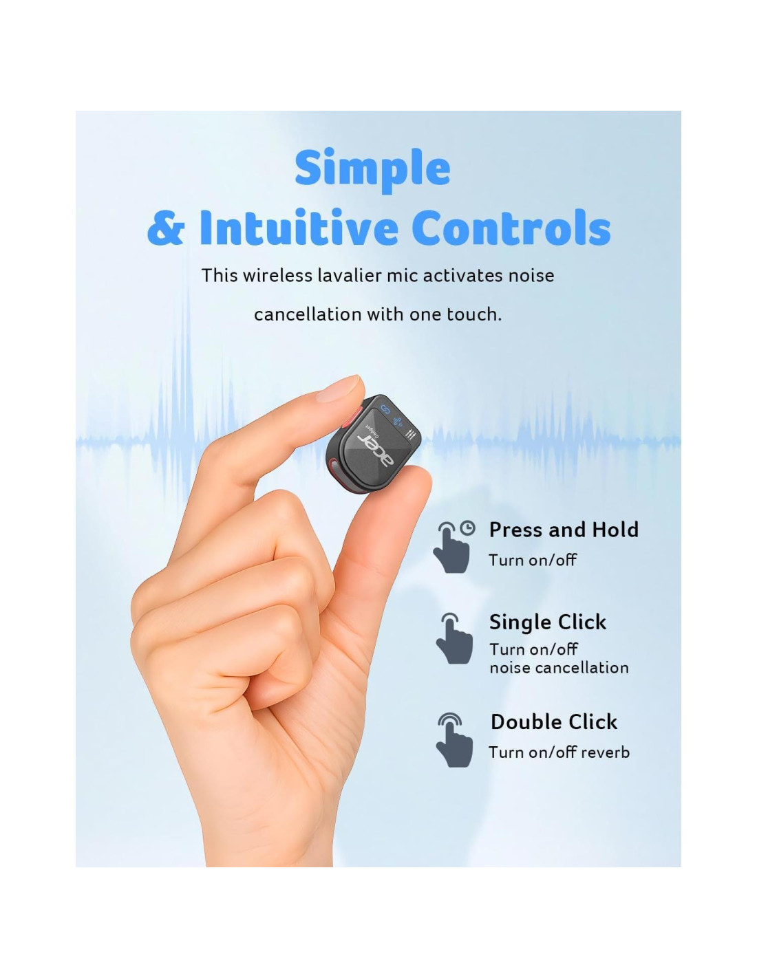 - [Controles simples e intuitivos] Este micrófono para iPhone se enciende/apaga con una larga presión-clic único para cancelación de ruido, doble clic para reverberación inmersiva. Ideal como micrófono lavalier inalámbrico, micrófono mini o micrófono Bluetooth para iPhone, es perfecto para oradores, creadores y vloggers: ideal para grabaciones de video, entrevistas o presentaciones en vivo. Compacto como un micrófono pequeño, es un micrófono versátil para iPhone.
