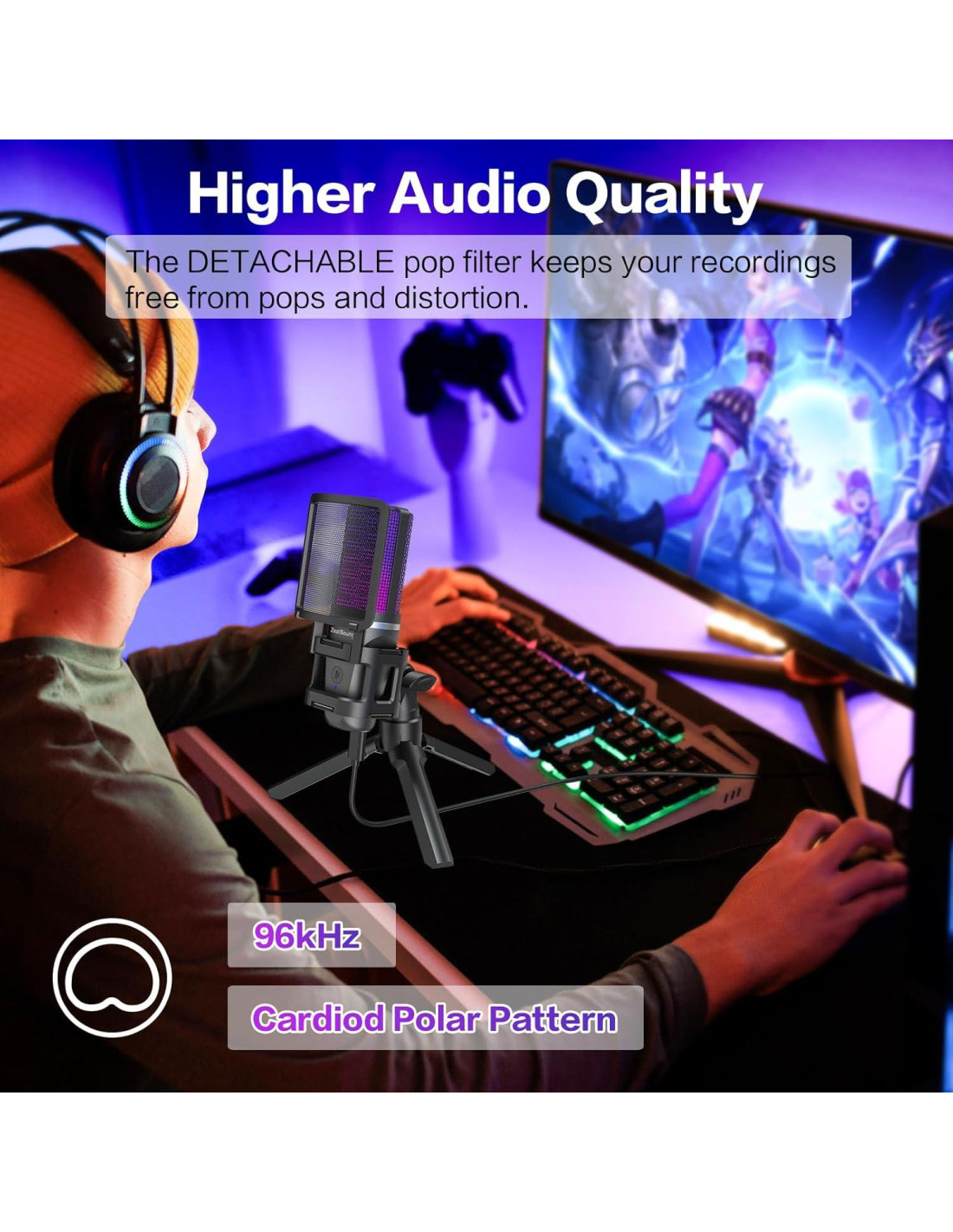 - [Fácil Configuración Plug&Play] Este micrófono de gaming USB para computadora está listo para usar con Computadora, Laptop, PC, Windows, Mac OS, PS4 y PS5 directamente de la caja. Conéctalo fácilmente a tu iPhone, Teléfono Tipo C, iPad o Tableta Android usando el ADAPTADOR USB PARA IPHONE incluido y el adaptador de Tipo C a USB. Pasos adicionales de configuración son innecesarios con esta solución plug-and-play. Es simple comenzar a crear contenido en video y participar en plataformas como YouTube, Instagram, Zoom, TikTok, Twitch y podcasting.