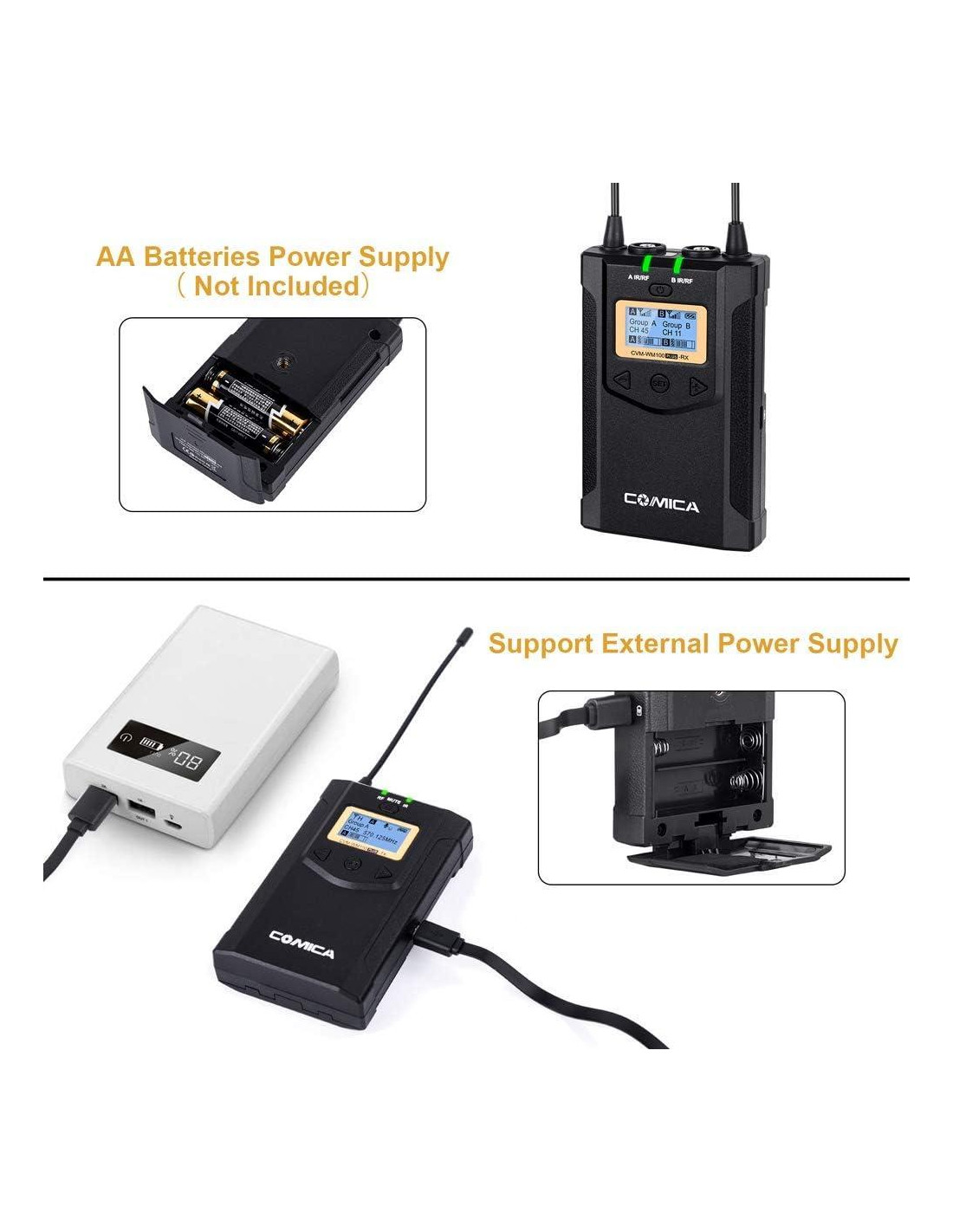 - Baterías AA y Fuente de Alimentación Externa: El micrófono lavalier inalámbrico CVM-WM100 PLUS puede ser alimentado ya sea por baterías AA o fuentes de alimentación externas, ofreciendo mayor flexibilidad para los usuarios.