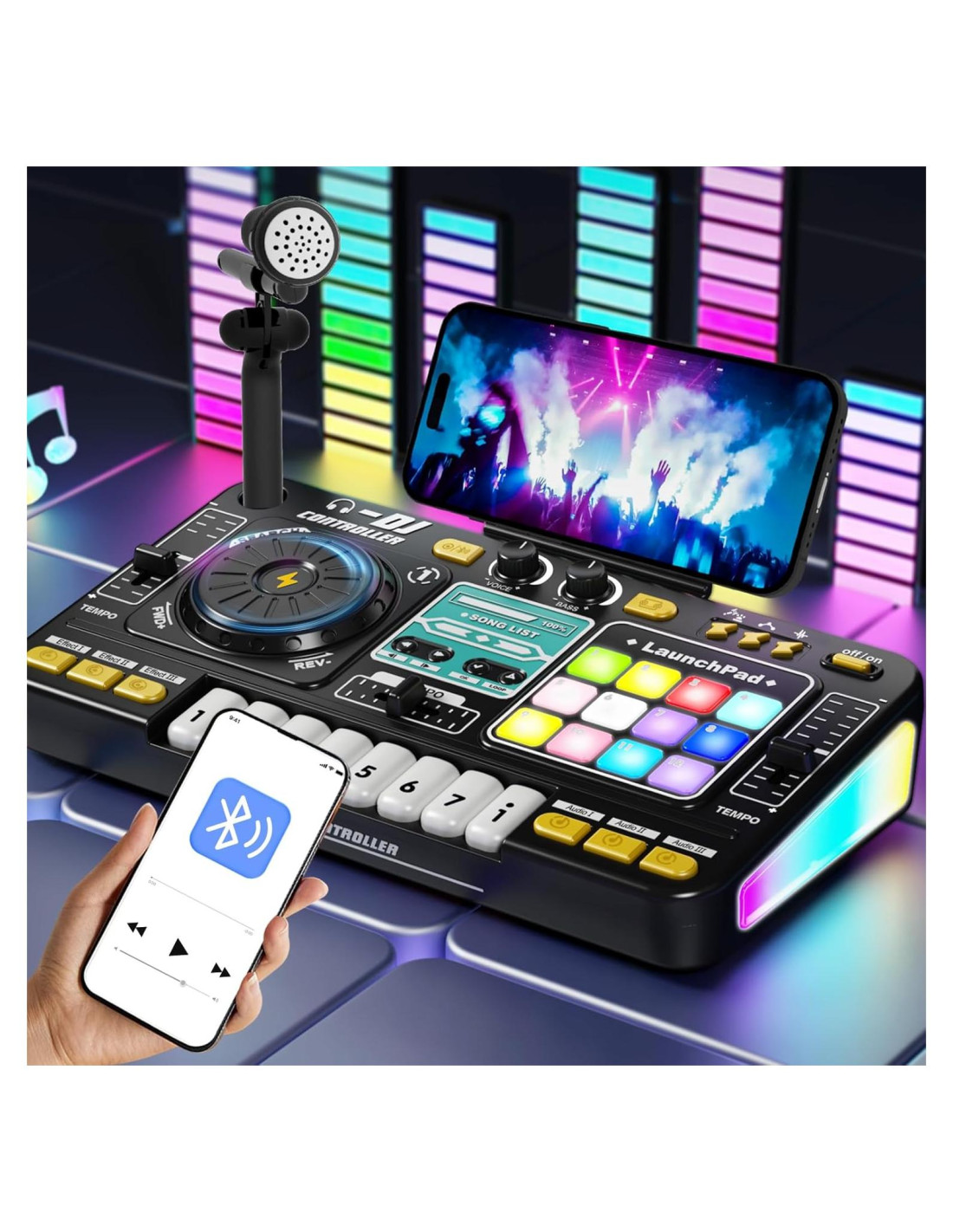- [Conexión Bluetooth] El micrófono desmontable soporta ajuste de múltiples ángulos para acomodar a niños de diferentes alturas. Presiona y mantén el botón de Bluetooth durante 2 segundos para conectar tu teléfono y reproducir tus canciones favoritas. ¡Toma el micrófono y comienza a cantar! Nota: Después de que Bluetooth esté conectado, el reproductor funcionará como un altavoz, y todos los demás botones y tornamesas DJ estarán deshabilitados.