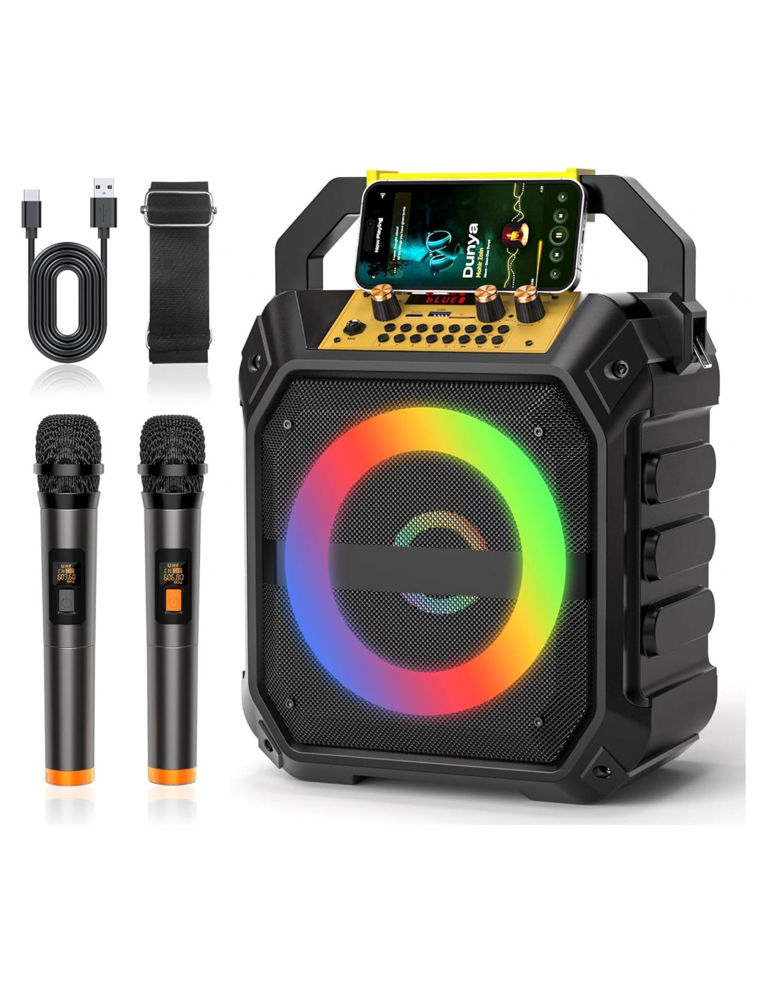 - Ligero y Portátil: Con esta poderosa máquina de karaoke portátil, puedes hacer fiesta donde quiera que vayas. Esta máquina de karaoke Bluetooth viene con una correa para el hombro para usar en cualquier lugar. La batería de litio de alta capacidad de 4000mAh permite disfrutar de 5-6 horas de reproducción ininterrumpida con una sola carga