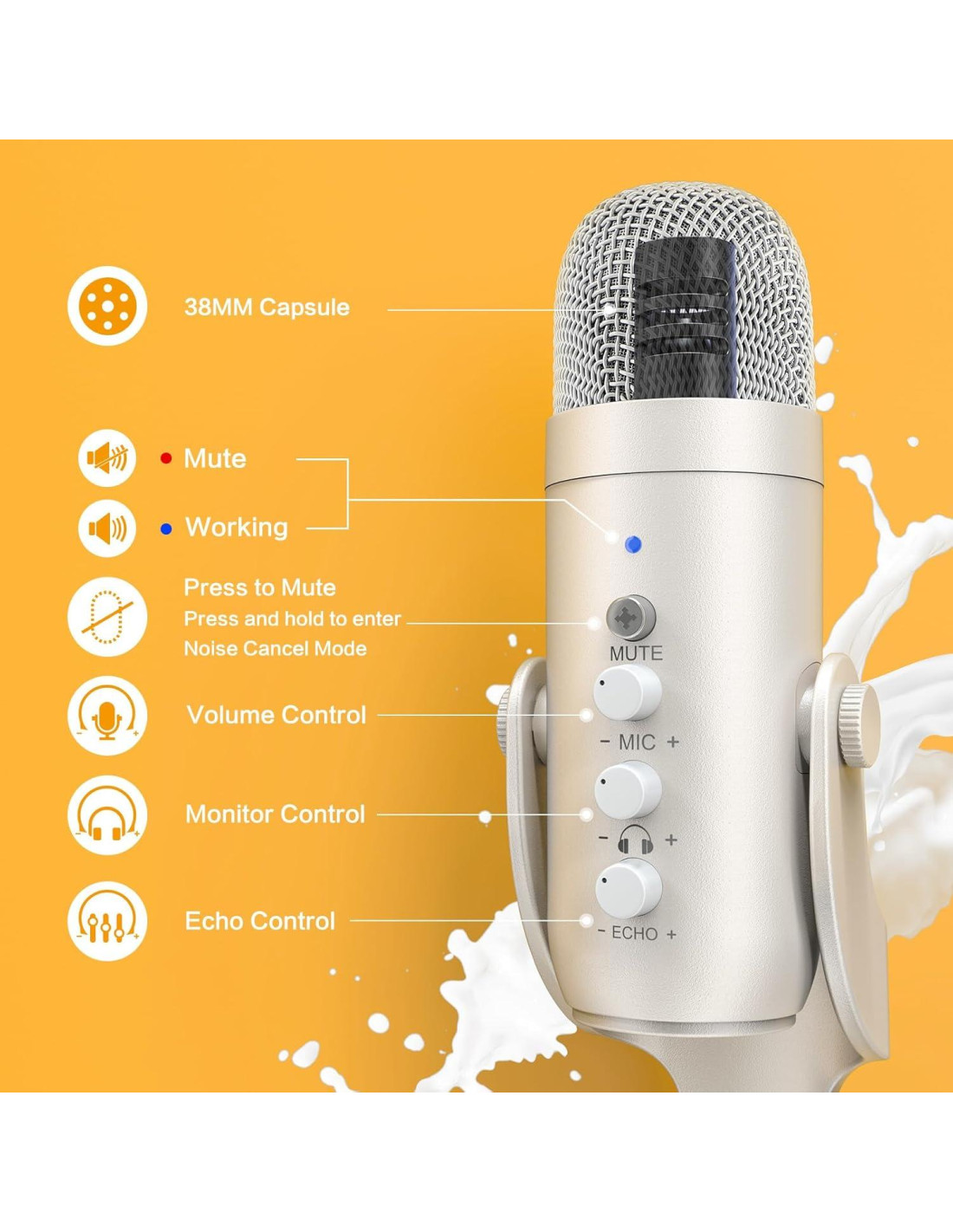 - RGB Controlable y Relajante: Eleva tu micrófono de juego de escritorio para PC con un anillo RGB personalizable en el micrófono. Ofreciendo una variedad de efectos de iluminación dinámicos y estáticos, te permite personalizar tu configuración para un aspecto visualmente impactante y llamativo. Para activar o desactivar los efectos RGB, presiona y mantén presionado el botón RGB. Para seleccionar diferentes efectos RGB, realiza una pulsación corta del botón RGB. Ideal para la creación de contenido en TikTok, YouTube, Facebook, Twitter y más.
