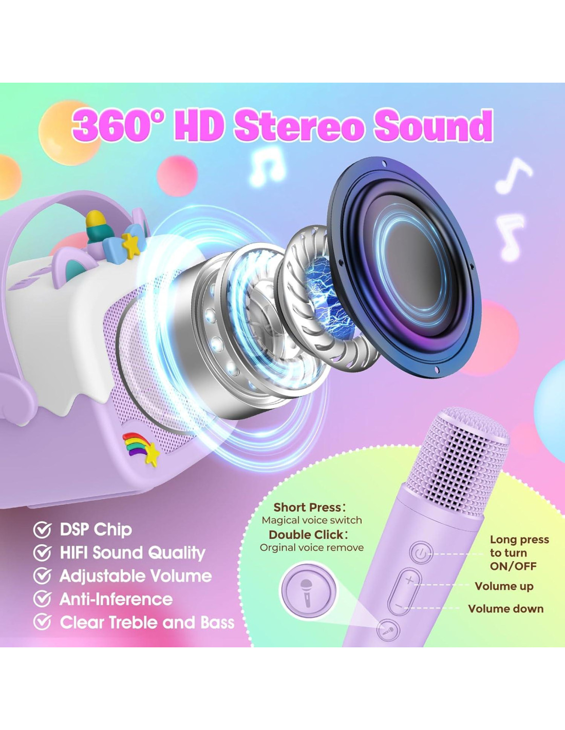 - Mini Máquina de Karaoke con Bluetooth 5.3: Equipado con Bluetooth 5.3 rápido y estable, nuestra máquina de karaoke temática de unicornio se conecta instantáneamente a teléfonos y tabletas, para que nuestros niños puedan cantar sus canciones favoritas en cualquier momento y lugar, construyendo confianza con cada actuación