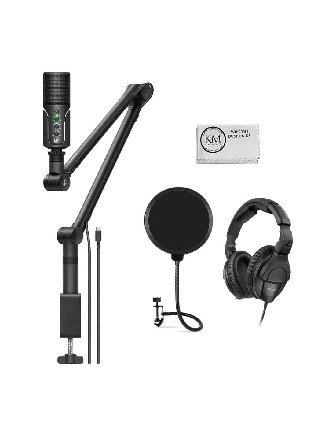 - [1] Conjunto de micrófono de condensador USB Sennheiser Profile para streaming con brazo articulado + [2] Auriculares de monitor cerrados circumaurales Sennheiser HD 280 Pro + [3] Filtro de pantalla contra el viento para micrófono + [4] Paño de limpieza de microfibra