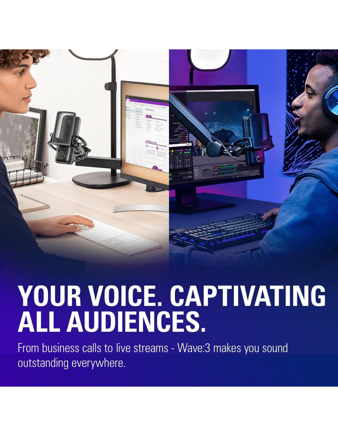 Wave:3 es un micrófono premium y solución de mezcla digital que fusiona la conveniencia de plug and play con circuitería de calidad de transmisión. Nunca más tendrás distorsión gracias a la tecnología anti-distorsión patentada. Toca el sensor capacitivo para silenciar silenciosamente tu alimentación de micrófono. Conecta auriculares para monitoreo sin latencia. Gira el dial para ajustar la ganancia de entrada, ajustar el volumen de monitoreo o hacer un crossfade entre tu micrófono y PC. Además, combina todas tus fuentes de audio y crea dos mezclas independientes: una para ti, una para tu audiencia, con la aplicación Wave Link. Wave:3 no solo le da a tu stream o podcast una firma sonora profesional. Te da control de todo tu flujo de trabajo de audio. Especificaciones técnicas Cápsula: 17 mm Electret Patrón polar: Cardioide Resolución: 24 bits Tasa de muestreo: 48 / 96 kHz Respuesta de frecuencia: 70 - 20000 Hz Sensibilidad: -25dBFS (ganancia mínima) | 15dBFS (ganancia máxima) SPL máximo: 120dB (140dB Clipguard activado) Rango dinámico: 95dB (115dB Clipguard activado) Interfaz: USB-C Dimensiones: 153 x 66 x 40 mm (6.0 x 2.6 x 1.6 in) Peso: Micrófono y U-Mount 280 g (9.88 oz) | Base 305 g (10.76 oz) Requisitos del sistema Windows 10 (64 bits) / macOS 10.15 o superior Puerto USB 2.0 4GB RAM