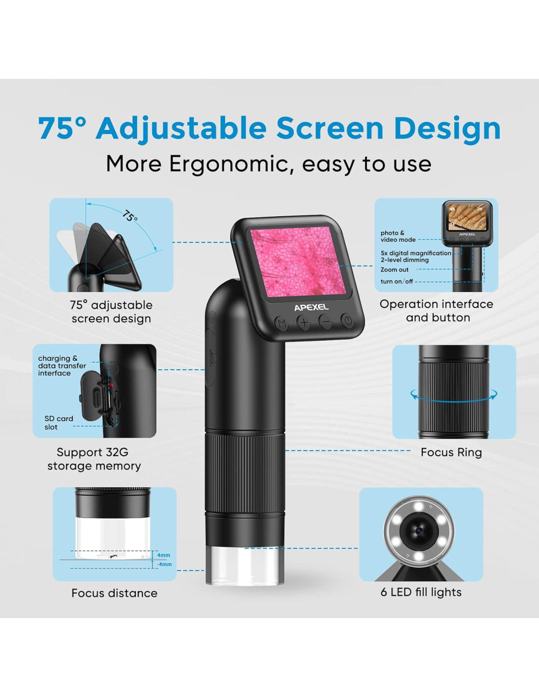 - [Microscopio Portátil de Bolsillo] Pesa solo 0.28 lb (130g), se puede poner fácilmente en tu bolsillo, diseño de pantalla ajustable de 75 grados, con batería de litio recargable (puede funcionar 3+ horas continuas), sistema de luz ajustable, todas estas funciones hacen de este mini microscopio electrónico, explorar el micro-mundo en cualquier momento y lugar.