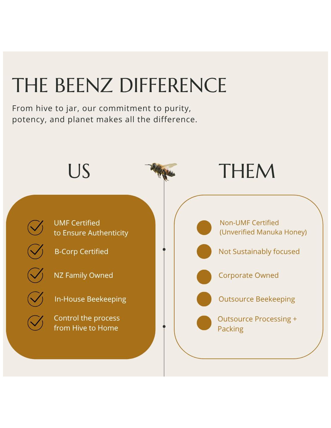 En los campos de nuestro hogar en Nueva Zelanda, florecen raras flores silvestres (que a nuestras abejas les encantan). A medida que estas flores florecen, comienza el viaje de la miel BeeNZ. Nunca tomamos más miel de la que se puede permitir, y a cambio, cuidamos excepcionalmente la salud y el bienestar de nuestra pequeña fuerza laboral. Aseguramos que todo sea perfecto, desde la temperatura de la miel hasta la velocidad de los batidores que suavemente incorporan nuestra miel en su textura de grado terciopelo. Envasamos toda nuestra miel en casa y la preparamos para enviarla alrededor del mundo. Después de todo el cuidado que hemos puesto en ella, puede ser difícil decir adiós. Miel de Manuka UMF 15+ Miel de Manuka UMF 5+ Miel de Manuka UMF 10+ Miel de Manuka UMF 20+ Miel de Manuka UMF 20+ 4.4oz Miel de Kanuka Paquetes de Miel de Manuka