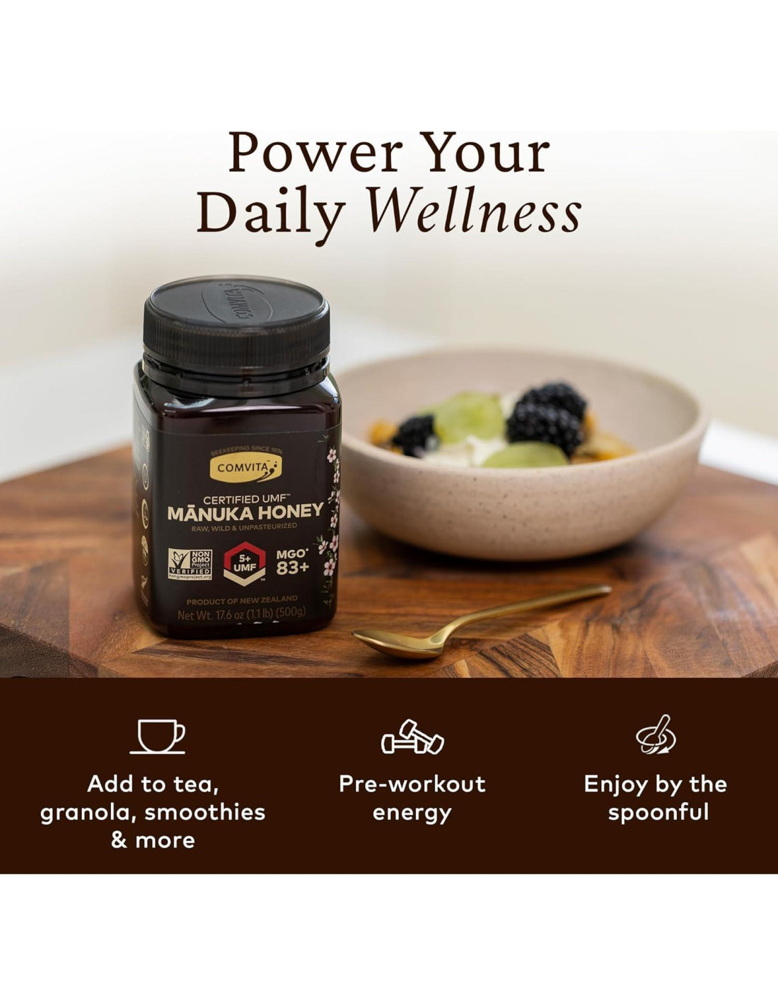 - CERTIFICADO UMF 5+ (MGO 83+) Auténtica, Miel de Manuka Cruda proviene del néctar de la flor de Manuka en los prístinos bosques de Nueva Zelanda. Comvita es el líder, ofreciendo Miel de Manuka Cruda, Silvestre, No Pasteurizada, Verificada por el Proyecto No OGM y Certificada Sin Gluten.