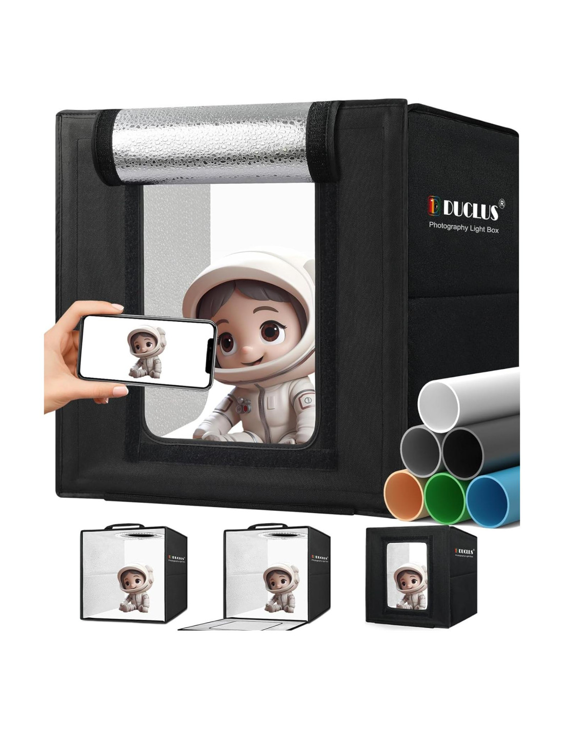 - Uso Amplio: Nuestro conjunto de caja de estudio fotográfico mini DUCLUS 10"x10"x10" es perfecto para usar tu teléfono inteligente o cámara para fotografiar joyería, miniaturas, cosméticos, arte de uñas, tarjetas deportivas, artesanías y otros artículos de menos de 17cm. Diseñada especialmente para fotógrafos, artistas, vendedores en línea y aficionados a la fotografía para mejorar tu juego fotográfico.