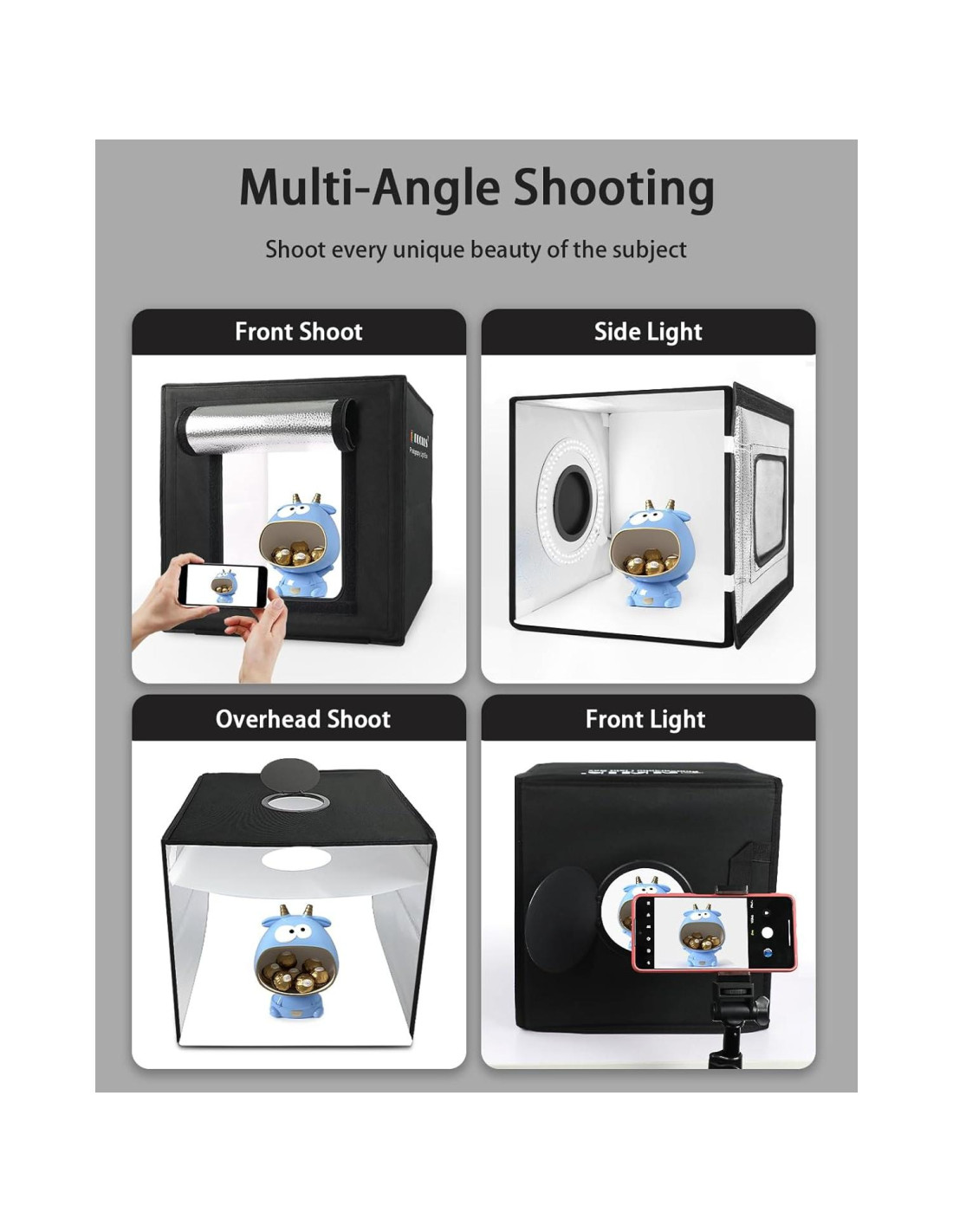 - Hasta 6+ Ángulos de Disparo: Nuestra caja de fotos es muy flexible y versátil, ayudándote a tomar fotos más creativas. No solo puedes elegir tomar una toma frontal desde la gran ventana, una toma más cercana desde la pequeña ventana, y una toma cenital desde la ventana superior, sino que también puedes ajustar la dirección de la fuente de la caja de fotos colocándola de lado, facilitando lograr una toma con luz lateral izquierda o derecha, o una toma con luz frontal, etc.