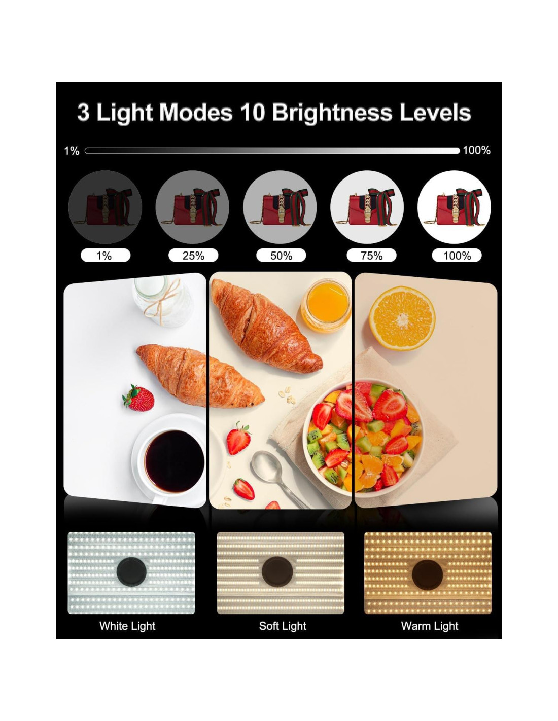 - 3 Modos de Luz. Luz Blanca / Luz Suave / Luz Cálida, la fotografía con caja de luz con temperatura de color de 3200-6500k, el atenuador de brillo de 10 niveles te permite controlar mejor el efecto de luz.