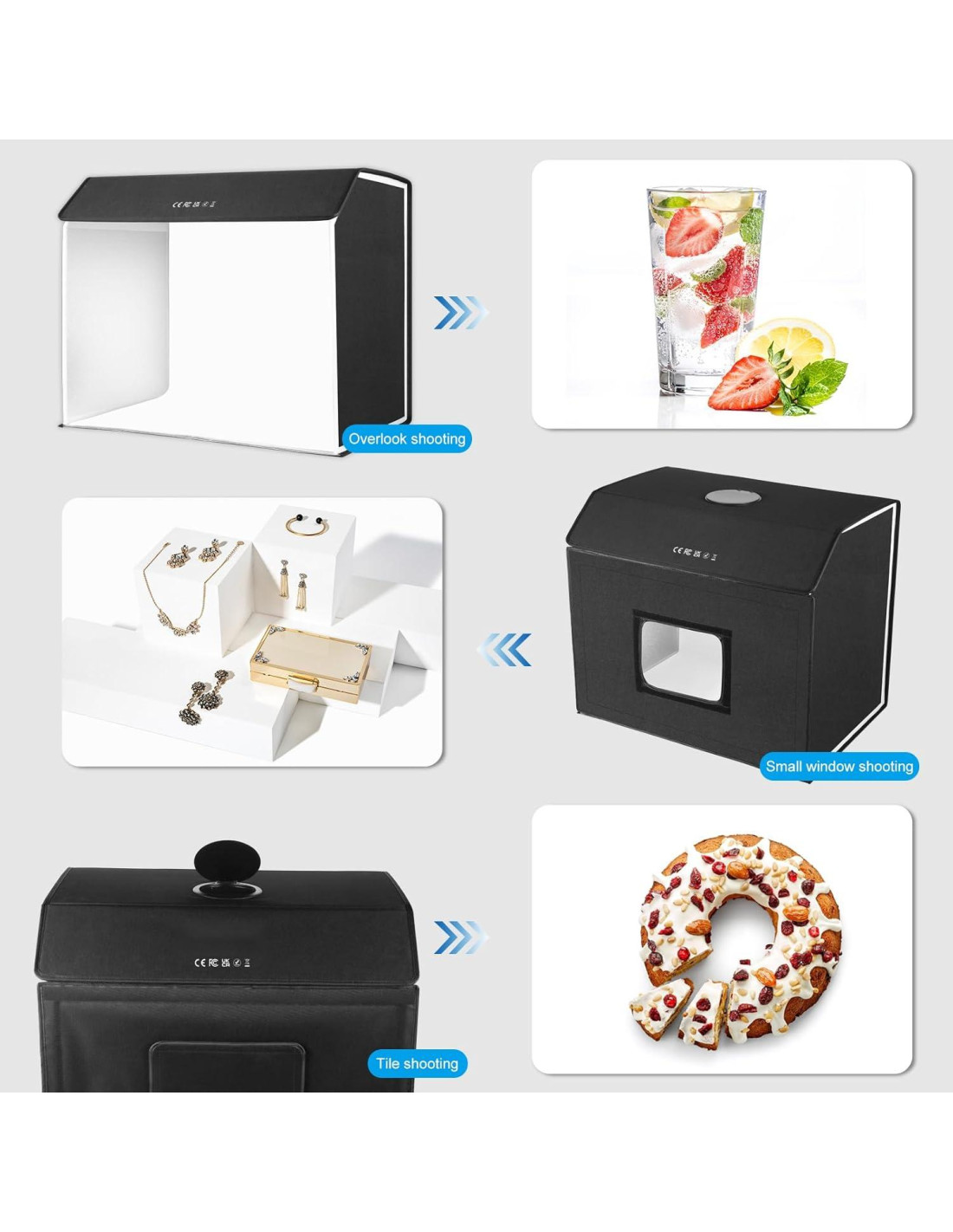 - Disparo Multiángulo. Nuestra caja de luz fotográfica está diseñada para una versatilidad máxima, ofreciendo 4 ángulos de disparo diferentes para capturar cada detalle de tu producto. Con iluminación ajustable, puedes resaltar las mejores características de tu producto y lograr fotos impresionantes de calidad profesional sin esfuerzo. Es la herramienta perfecta para cualquiera que busque elevar su fotografía de productos y crear imágenes llamativas que se destaquen.
