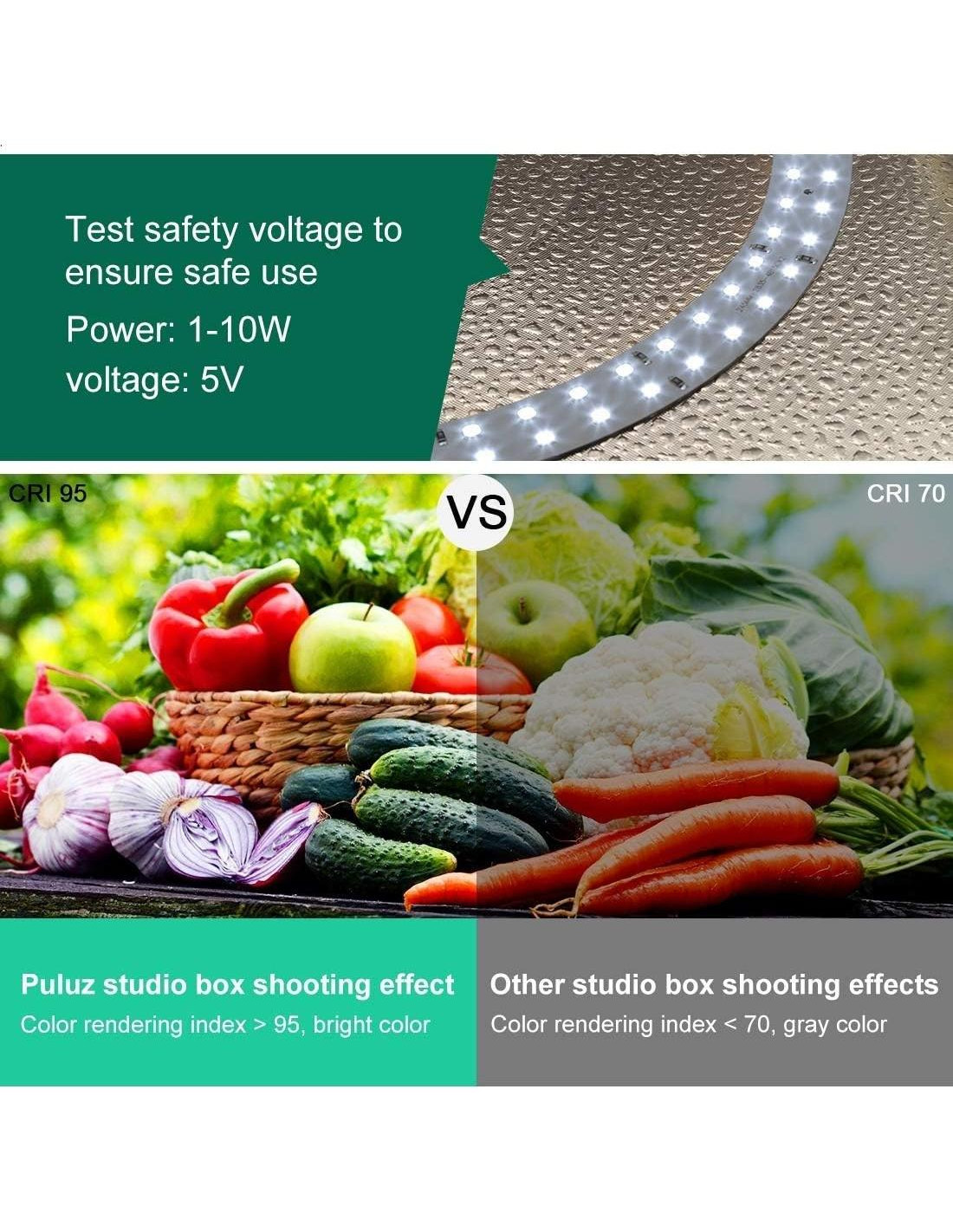 - Luces de Alto CRI La parte interior utiliza un panel LED en forma de anillo hecho de 112 perlas de lámpara de alto índice de reproducción cromática. Puede mostrar excelentes efectos fotográficos. El índice de reproducción cromática CRI95 de la luz blanca temperatura de la placa de luz está hecho de tela de grano de piedra, suaviza el brillo y aumenta la sensación tridimensional del artículo.