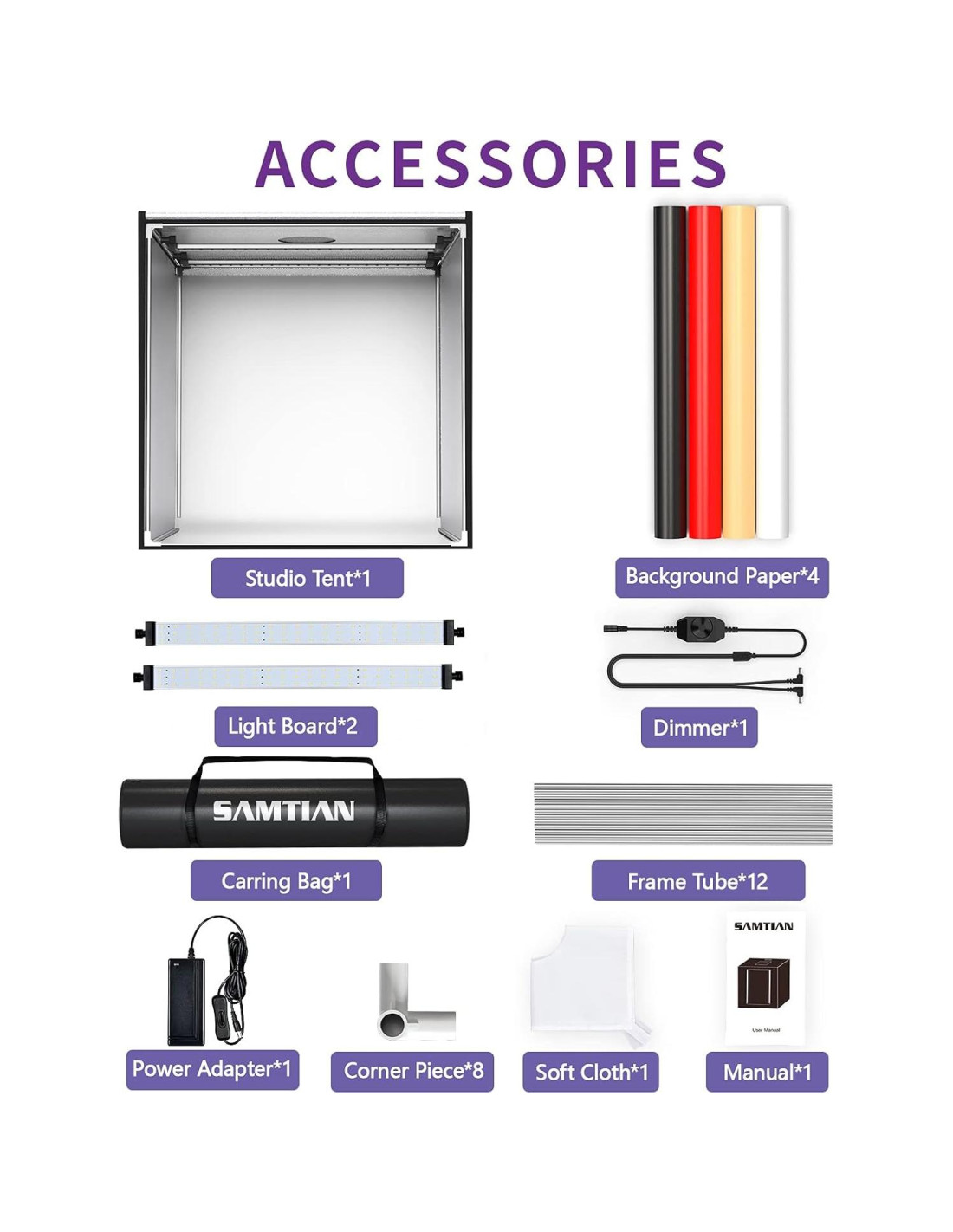 SAMTIAN es una empresa especializada en la producción de cajas de fotos, luces de anillo, luces LED para video, cajas de luz LED, micrófonos y otros tipos de equipos de fotografía. Tenemos un departamento profesional de investigación y desarrollo, un departamento de moldeo por inyección, un departamento de desarrollo de productos y un departamento de control de calidad, proporcionando mejores productos y servicios para fotógrafos, videógrafos y principales contribuyentes de fotografía en todo el mundo. CRI: >95 Entrada: 100-240V Lumen: 12000-13000LM Temperatura de Color: 5500K Regulación de Brillo: 10%-100% Vida Promedio de los LEDs: 50000H Fuente de Luz: 126 pcs LED Luz Material de la Placa de Luz: Aluminio Material de la Caja de Fotos: Marco de Hierro + Tela Oxford Tamaño del Producto: 80*80*80CM / 32*32*32Pulgadas