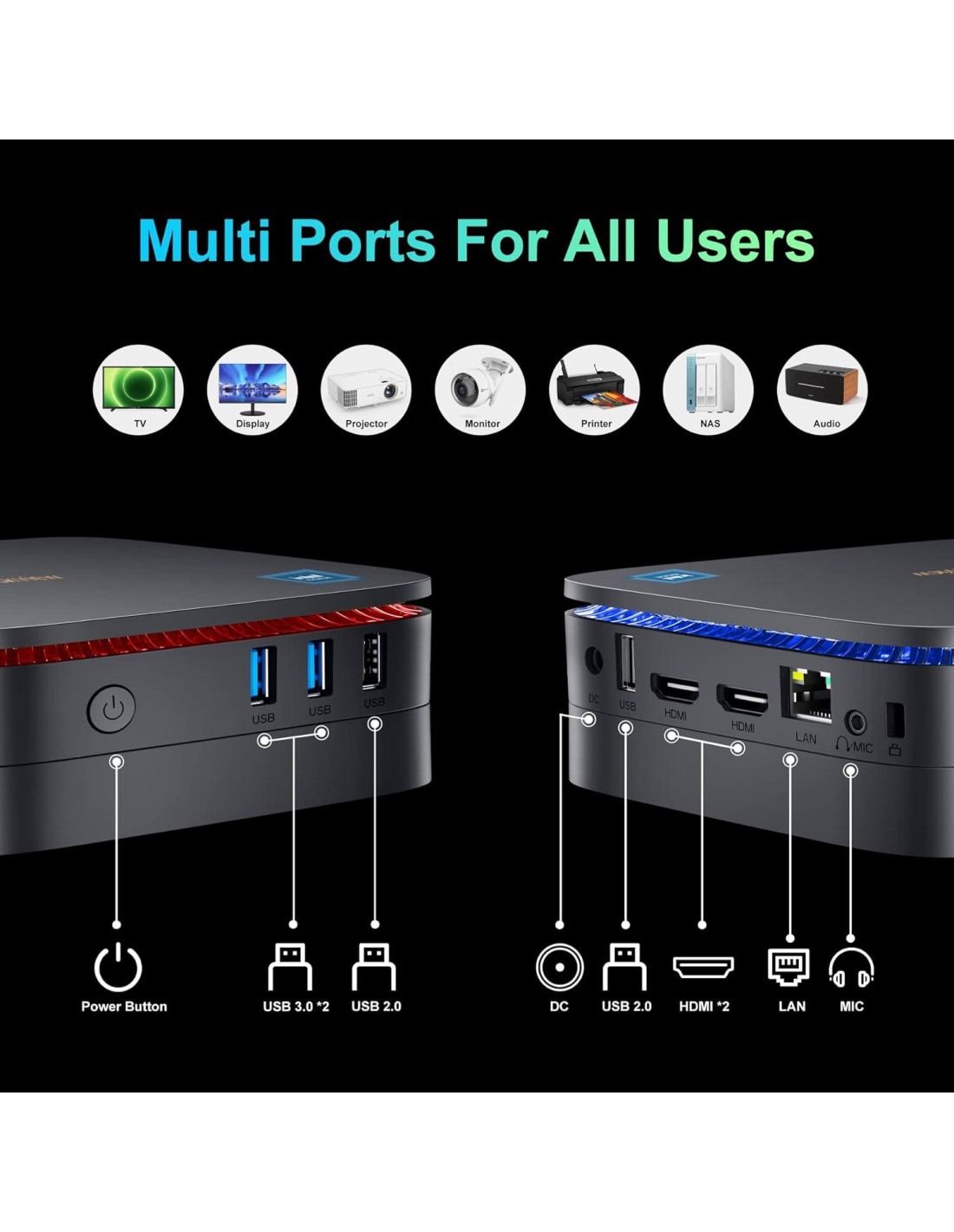- FORTALECE TU ESPACIO DE TRABAJO El mini pc n150 está equipado con USB2.0 Tipo-A * 2, USB3.0 Tipo-A * 2, 4K HDMI 1.4b Tipo A * 2, puerto Ethernet Gigabit RJ45 * 1, Jack DC * 1, Jack de Audio-in/out de 3.5mm * 1, y WiFi de doble banda 2.4G+5.0G, Bluetooth 4.2. Soporta múltiples conexiones Bluetooth y el puerto Ethernet Gigabit ofrece conectividad de red ultra-rápida. Estas características facilitan la conexión a varios dispositivos, incluyendo servidores, equipos de oficina, proyectores, televisores, etc.