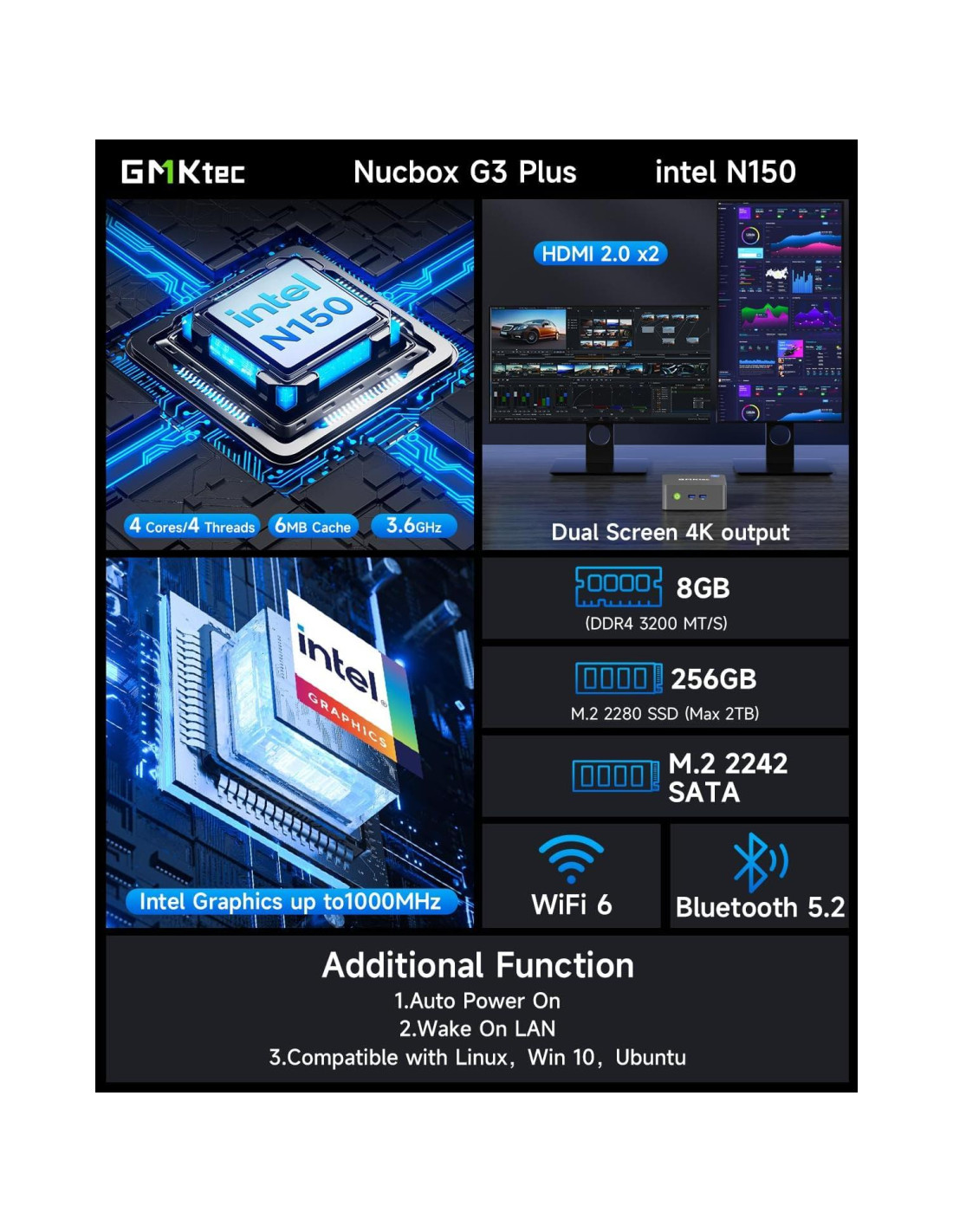 - INTERFAZ RICA - La mini computadora Nucbox G3 está equipada con USB 3.2*4, hasta 5Gbps/S, HDMI(4K@60Hz)x2, Jack de Audio de 3.5mm. Soporta WiFi 6 y conectividad de red Ethernet RJ45 2.5GbE, Bluetooth 5.2. Este Mini PC soporta la conexión de múltiples dispositivos y puede ser utilizado con servidores, equipos de monitoreo, equipos de oficina, pantallas, proyectores, televisores, etc.