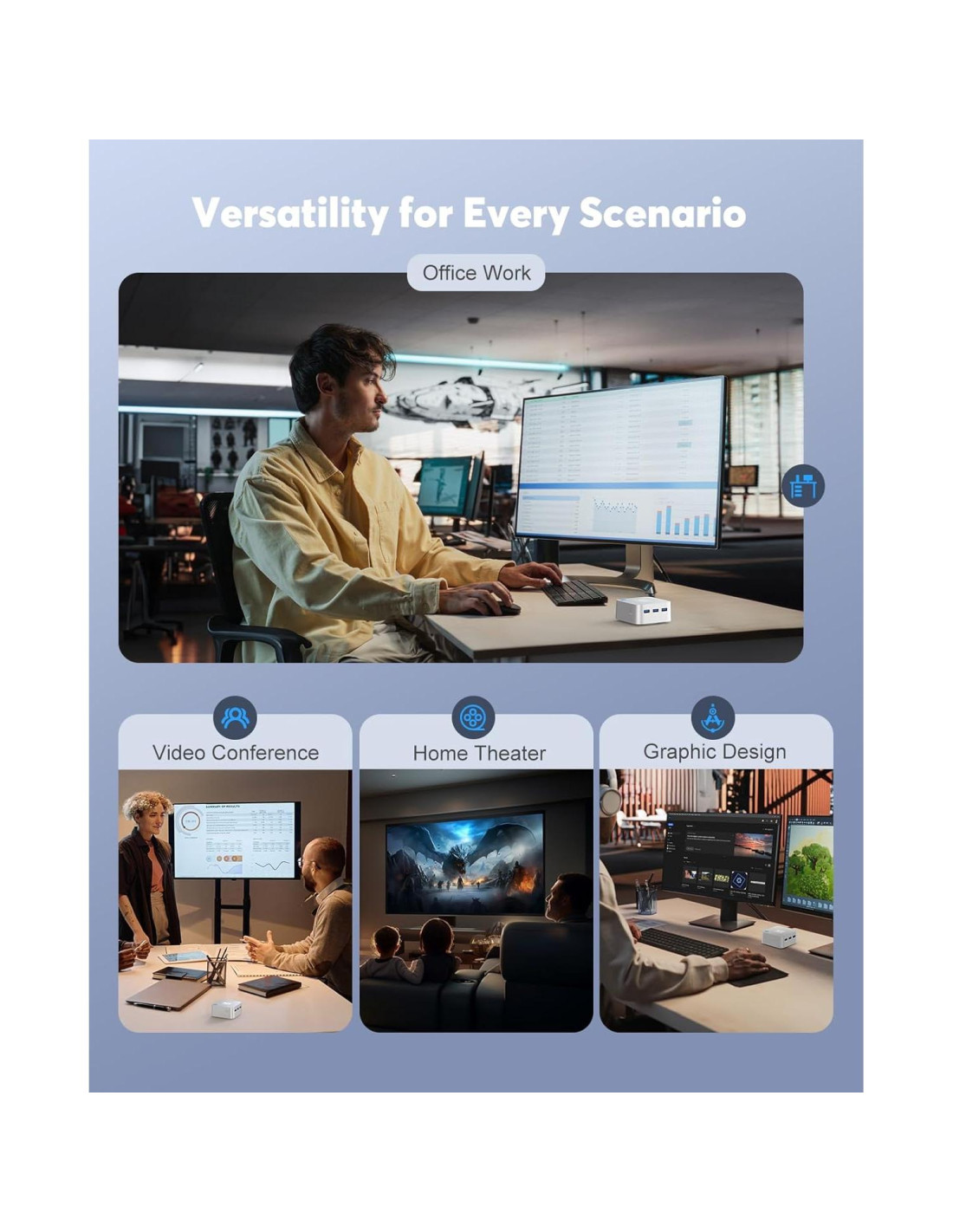 - Mini PC más pequeño. Es un 45% más pequeño que los mini ordenadores promedio. Puedes sostenerlo fácilmente en tu mano o llevarlo en una mochila. El mini PC de escritorio es adecuado para trabajo de oficina o cines al aire libre. Nuestro soporte VESA complementario puede montar el pequeño PC en la pared o monitor.