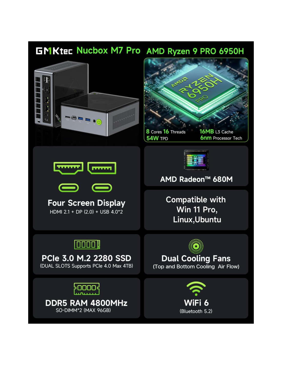 - [PC Mini Gaming Premium] El Nucbox M7 Pro Mini PC es una computadora de escritorio de pequeño formato con un procesador AMD Ryzen 9 PRO 6950H (8C/16T hasta 4.9Ghz). La GPU está integrada con una potente tarjeta gráfica AMD Radeon 680M de 12 núcleos; el rendimiento es casi comparable al de una NVIDIA GTX 1050 Ti completa. Junto con el soporte de la tecnología FSR 3.0+, la computadora puede manejar tareas de computación pesadas y juegos AAA