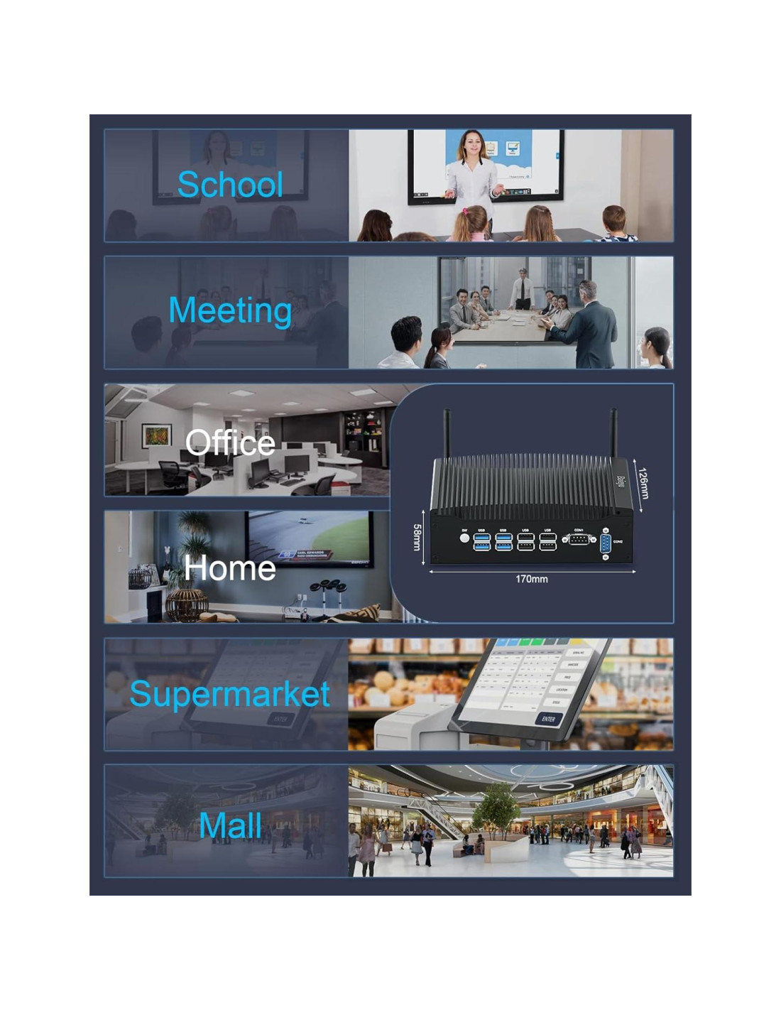 - [Salida HD de Pantallas Duales 4K] Este Mini PC de Escritorio soporta la visualización simultánea en dos pantallas a través de 2 * puertos HD, mejorando la eficiencia laboral. Puede usarse como PC o HTPC para cine en casa. Así que puedes usarlo en tu oficina, centro de capacitación, fábrica, café internet o donde desees. Además, también tiene un diseño único sin ventilador, y el diseño de ventilador de enfriamiento de bajo ruido significa una disipación de calor más eficiente, proporcionando un entorno de trabajo más fresco y silencioso para el mini PC.