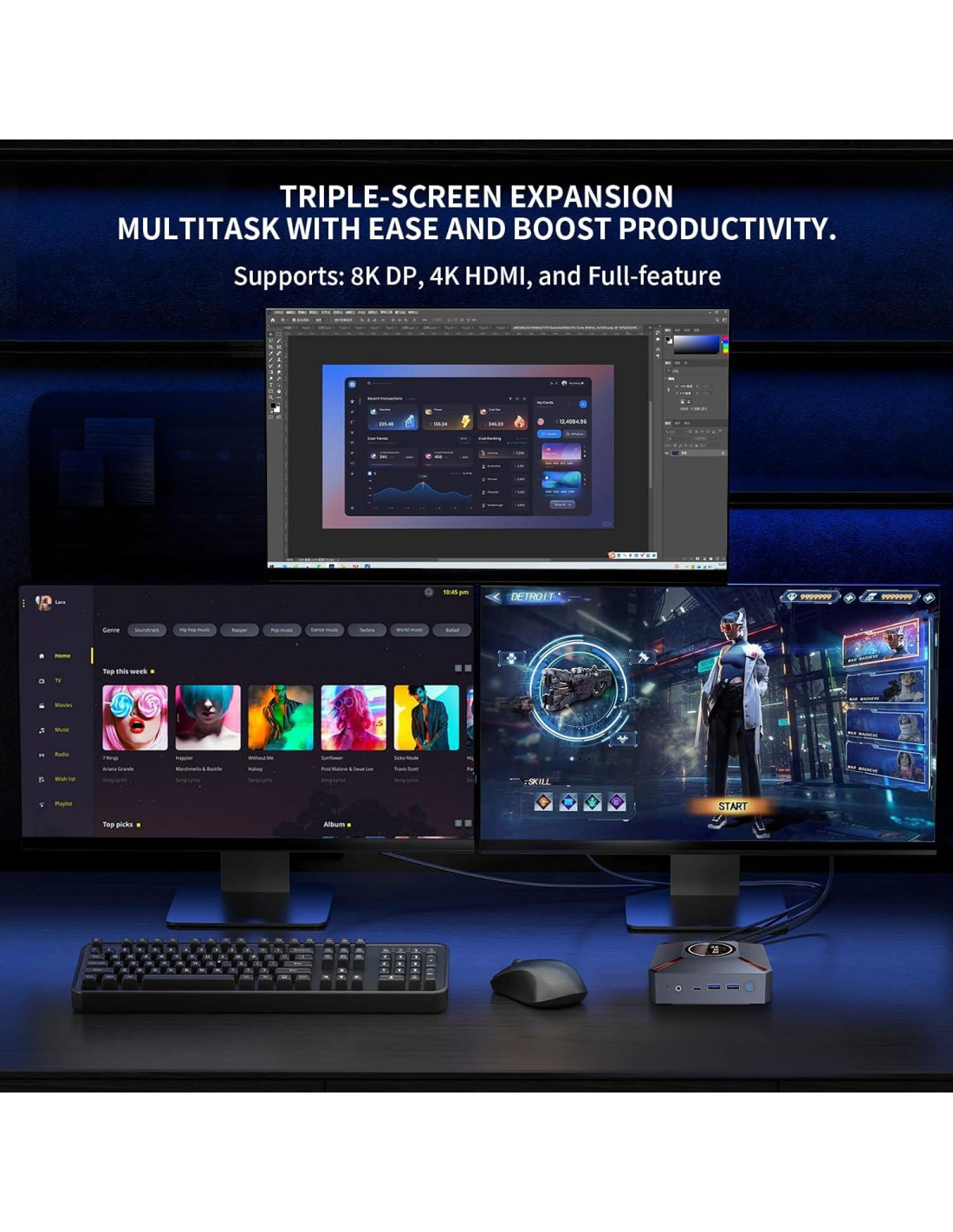- [Potente CPU Intel Core i9] Impulsado por el Intel Core i9-12900HK (14 núcleos, 20 hilos, hasta 5.0GHz), con 24 MB de caché. Nuestro Mini PC i9 ofrece un rendimiento rápido y receptivo para multitarea, trabajo, streaming o entretenimiento en casa