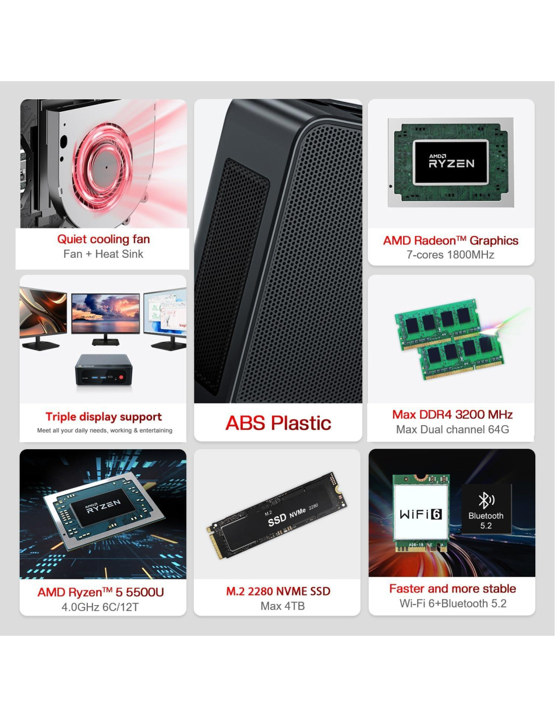 Equipado con el potente CPU AMD Ryzen 5 5500U (2.1-4.0GHz, 6C/12T, L2 3MB, L3 8MB), rendimiento estable y confiable, latencia y retraso reducidos, potencia de carga y procesamiento potente para una experiencia más fluida. Ryzen 5 5500U tiene 6 núcleos, 12 hilos, que es más potente que i7-1165G7. Con velocidad de respuesta más rápida y respuesta sensible multihilo, se utiliza ampliamente para edición de imágenes, aplicaciones de oficina, centros de medios, mini servidores, educación, navegación web, juegos y mucho más. Memoria RAM DDR4 de 16GB incorporada. Soporta un máximo de 32GB en un solo canal a 3200Mhz, y 64GB en doble canal a 3200Mhz, jugando juegos y trabajando de manera más fluida. SSD NVMe M.2 2280 de 500GB incorporado, proporcionando suficiente capacidad para almacenar imágenes, videos, música, juegos, etc. Soporta un máximo de 4TB después de quitar el SSD original. También puedes usar un HDD SATA de 2.5" (máx. 2TB) para expandir el almacenamiento, más espacio de almacenamiento hará que el Mini PC funcione más suavemente. Construido con Bluetooth 5.2, WiFi 6 (802.11ax, 2400Mbps, 2.4Gbps) y LAN RJ45 de 2.5Gbps, soporta más y más rápidos terminales. Equipado con un potente ventilador y tubo de doble conducción de calor, puede detectar automáticamente el estado de enfriamiento y cambiar la temperatura de la CPU, manteniendo la estabilidad del sistema. Con el tamaño 126 x 113 x 40 mm, el mini pc es muy pequeño. Diseño pequeño y ligero hace que la oficina sea más ordenada. Puedes llevarlo a cualquier lugar. Ideal para viajes de negocios. SER5 Mini PC MINI S12 Mini PC MINI S13 Mini PC SER5 MAX Mini PC SER5 MAX Mini PC SER8 Mini PC